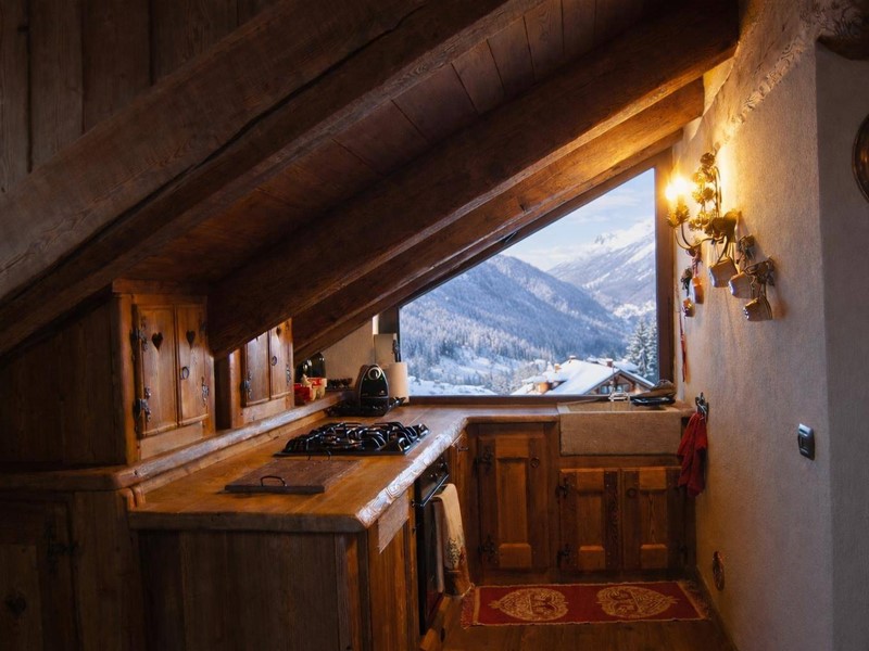 La zona giorno è completata da un suggestivo angolo cucina di sicuro impatto estetico, caratterizzato da dettagli ricercati e finiture che richiamano le ambientazioni delle più eleganti riviste dedicate agli chalet di montagna: uno spazio scenografico ma al tempo stesso funzionale, completo di ogni comfort.