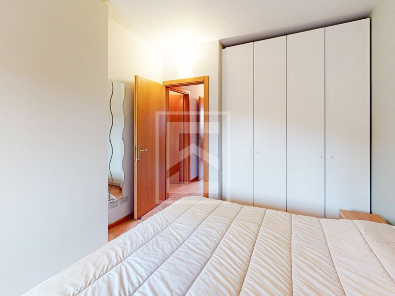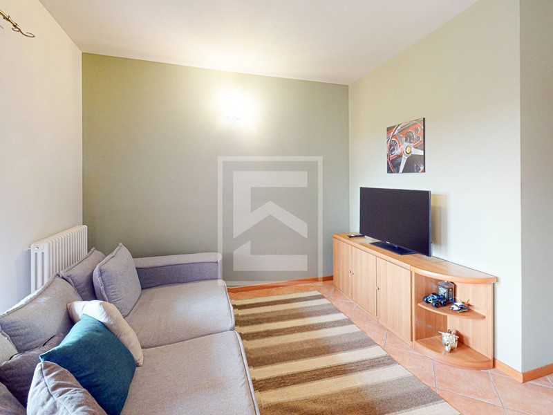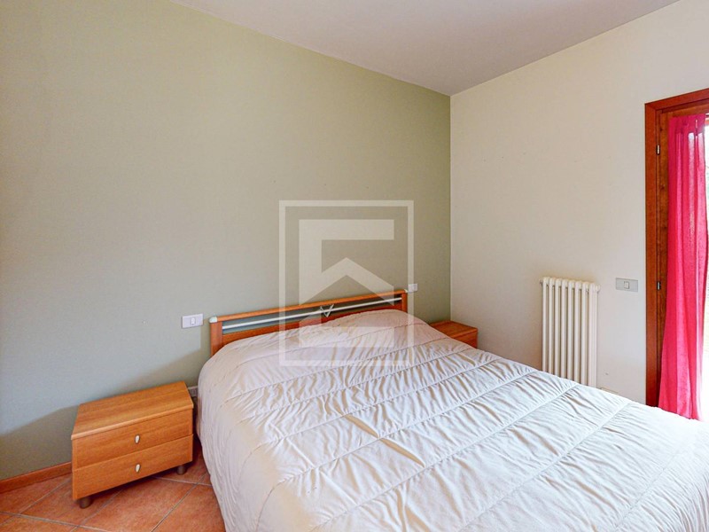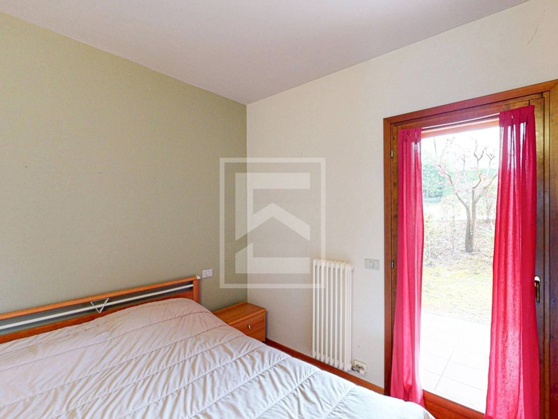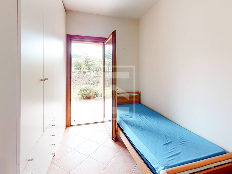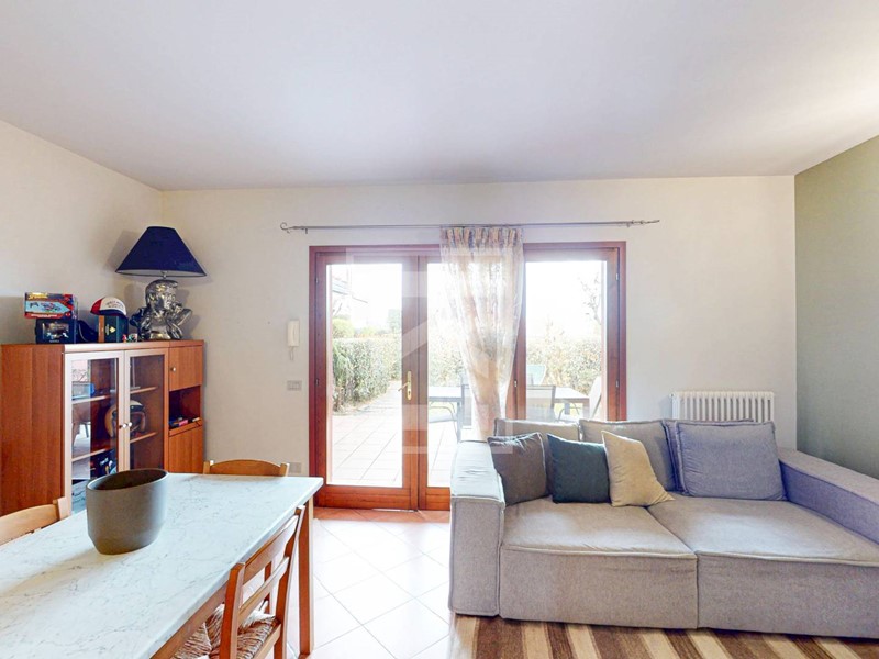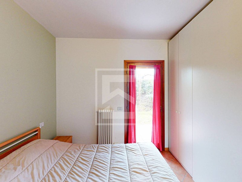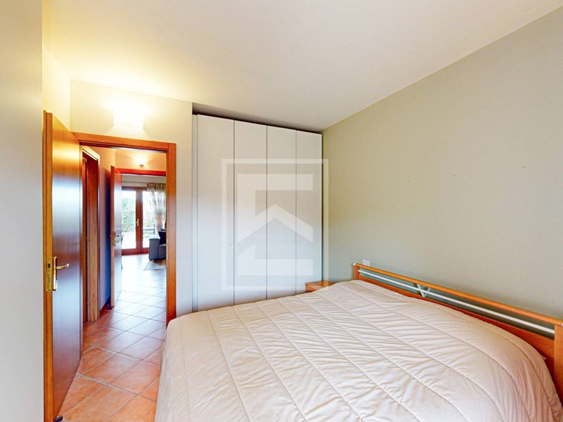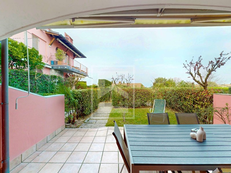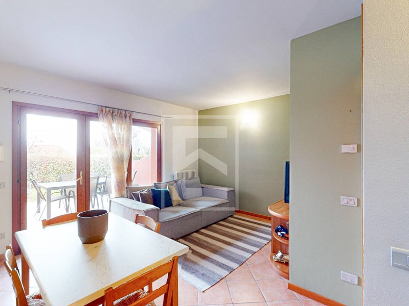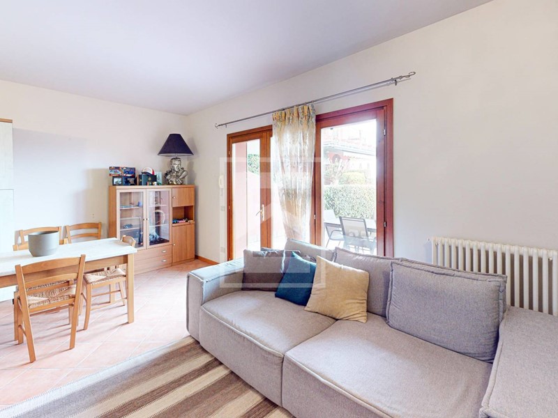 L'ingresso conduce direttamente alla zona giorno con cucina a vista, resa luminosa da unampia porta-finestra che dà accesso al giardino frontale di proprietà, dal quale si gode di uno scorcio di vista lago. L'area esterna offre inoltre la possibilità di una recinzione completa per garantire la massima privacy. Il reparto notte è composto da un disimpegno, una camera matrimoniale, una seconda camera e un bagno. Entrambe le camere dispongono di accesso diretto a un secondo giardino privato situato sul retro dell'abitazione.