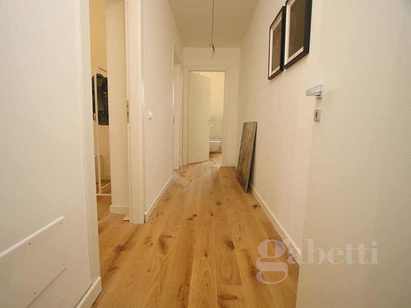 Ingresso sulla luminosa zona living con soggiorno e parete cottura, disimpegeno due camere bagno con doccia