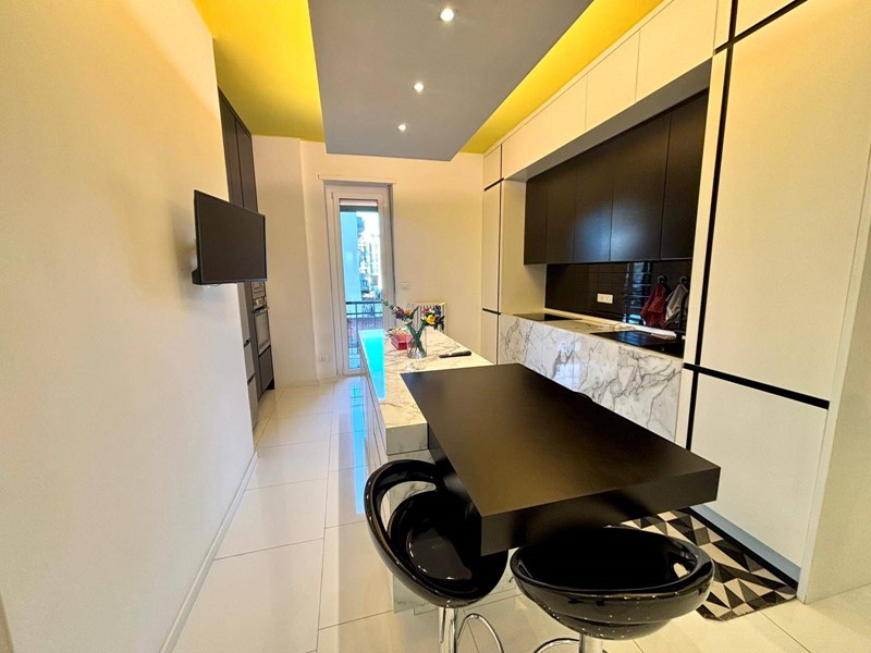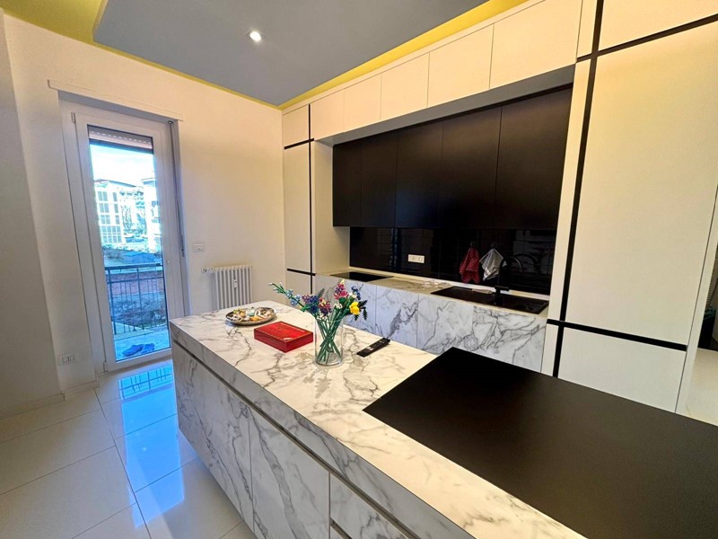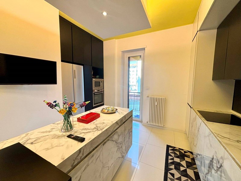 Ingresso su ampia zona living con soggiorno ampio e cucina attrezzata a vista con isola, 2 camere da letto di cui 1 matrimoniale ed una singola, 2 bagni con box doccia (di cui uno in suite) e 2 balconi.