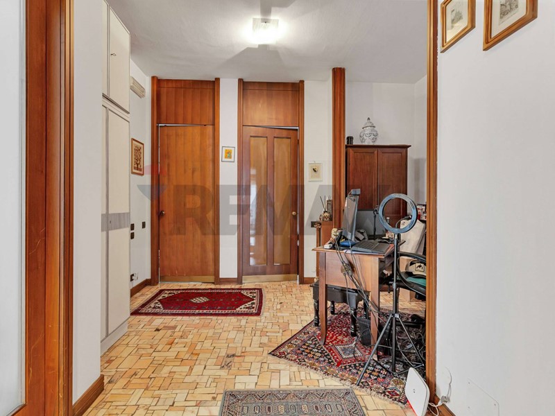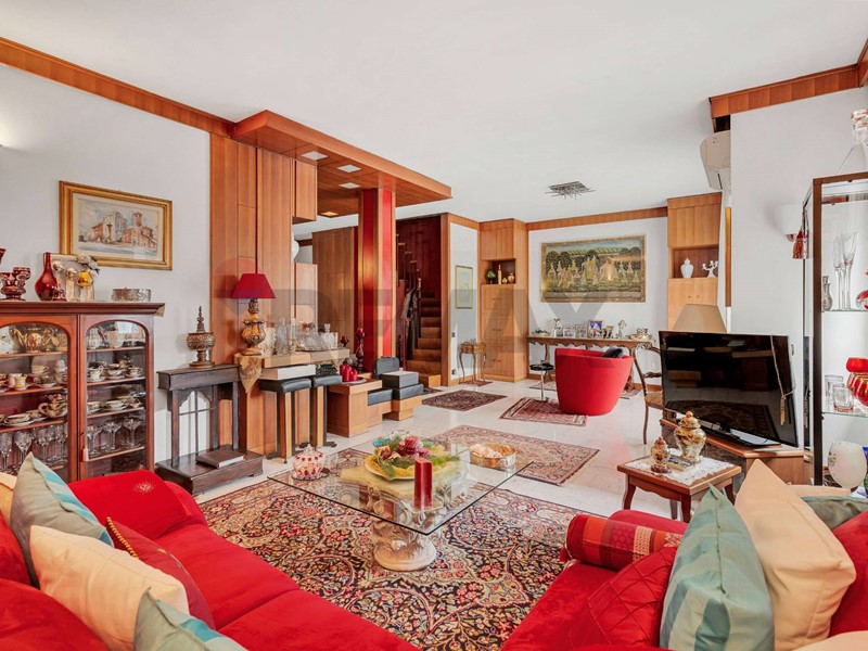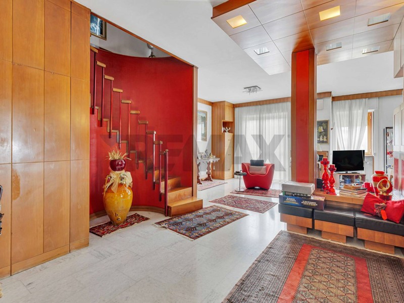 Le dimensioni generose che caratterizzano questo appartamento di 213 mq catastali (di cui 194 escluse le aree scoperte) si percepiscono già all'ingresso. Aprendo la porta troviamo un grande spazio di ingresso comodo per liberarsi di scarpe, cappotti, e borse appena entrati in casa. Sull'ingresso si affacciano la scala per accedere al piano superiore, il soggiorno, la cucina e disimpegno per la zona notte.