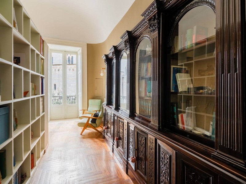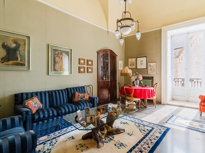 Il primo piano, cuore della residenza, sviluppa circa 250 mq di superficie coperta e circa 35 mq di spazi esterni. Qui si trovano gli ambienti principali della dimora: ampie sale di rappresentanza e camere luminose che si affacciano direttamente sulla Cattedrale attraverso balconi storici, regalando viste di grande suggestione sul monumento e sulla piazza. Gli spazi interni si completano con ambienti dedicati alla convivialità e ai servizi, oltre a una riservata terrazza a livello.