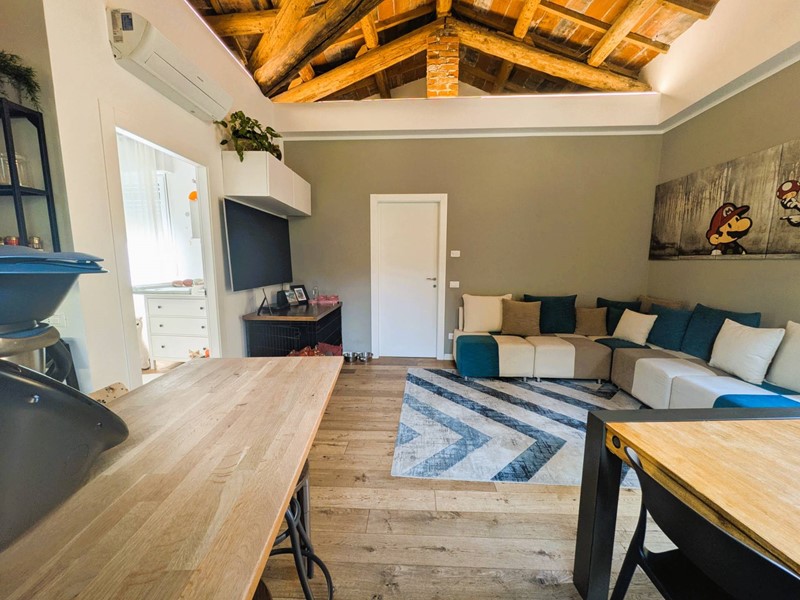 Gli Interni: Design e CaloreL'ingresso si apre su un pratico spazio ripostiglio, per poi svelare la vera anima della casa: una zona giorno open space dominata da alti soffitti con splendide travi a vista. La luce naturale e il calore del legno creano unatmosfera intima e ricercata. Dalla zona living si accede direttamente a uno studio/cameretta, perfetto per lo smart working, per accogliere gli ospiti o come camera per bambini. La zona notte comprende una camera matrimoniale completa di cabina armadio e un elegante bagno finestrato.
