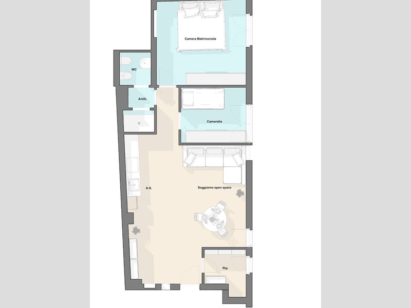 Nellannuncio sono presenti sia le fotografie dello stato attuale, sia un progetto rendering che mostra unipotesi di ristrutturazione degli spazi, con la possibilità di ricavare una seconda camera e ottimizzare la distribuzione interna, trasformando lunità in un comodo trilocale residenziale.