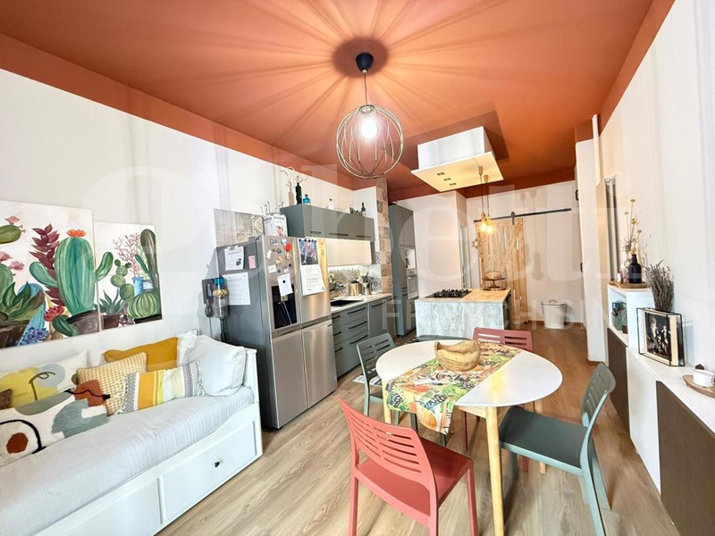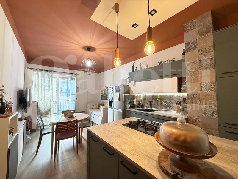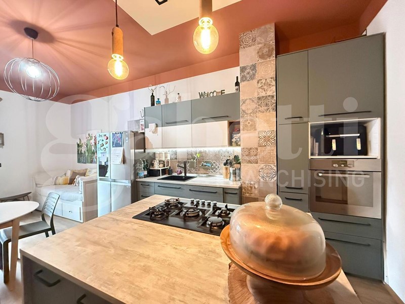 L'ingresso conduce a un pratico disimpegno che accompagna alla zona giorno, caratterizzata da un moderno soggiorno con parete cottura a vista e isola all'americana, uno spazio conviviale pensato per la vita quotidiana e per accogliere amici e familiari, da cui si accede al primo balcone.