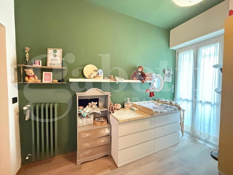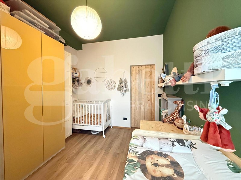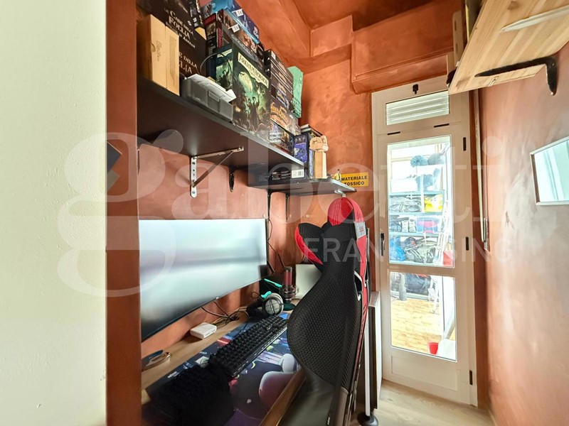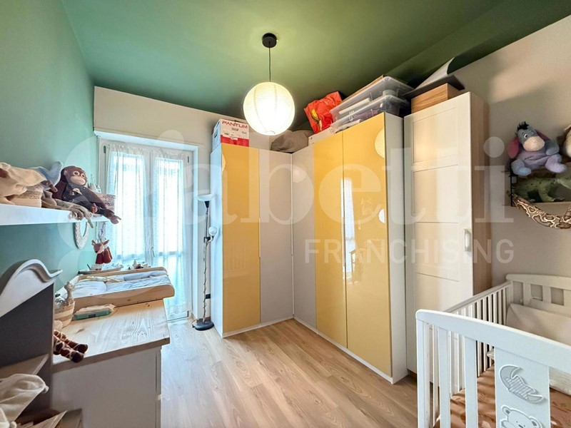 La zona notte comprende una camera da letto matrimoniale con balcone verandato, impreziosita da un vano aggiuntivo attualmente adibito a studio, soluzione ideale per chi lavora da casa, e una cameretta, perfetta come stanza per bambini, ospiti o ulteriore studio. Il moderno bagno con doccia e un comodo ripostiglio completano la proprietà.