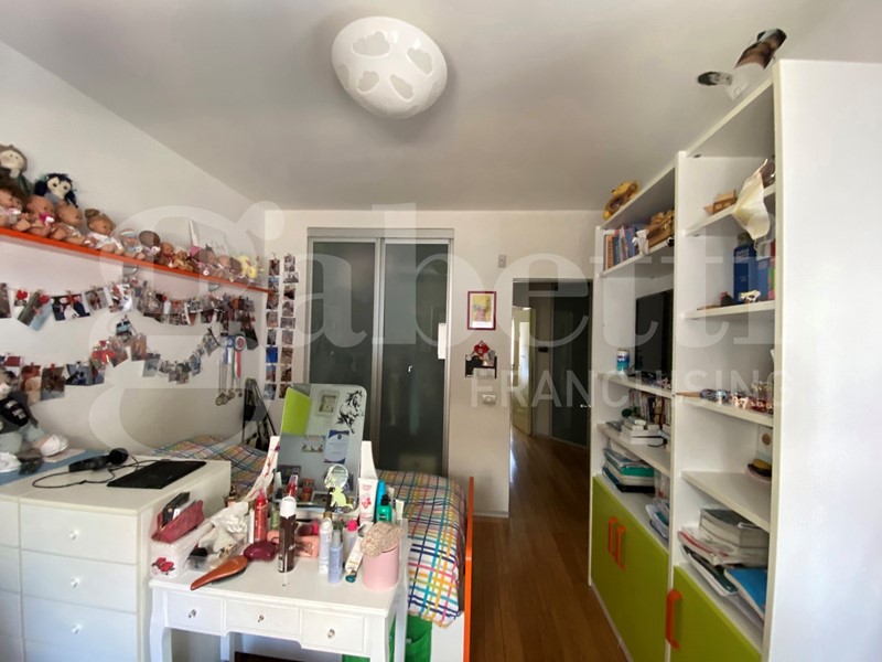 La zona notte comprende una camera matrimoniale con bagno privato e cabina armadio, oltre a una cameretta anch'essa dotata di cabina armadio. Gli infissi in legno e alluminio con doppio vetro garantiscono un'ottima insonorizzazione e isolamento termico. Con una doppia esposizione e un terrazzo di proprietà, questo appartamento è perfetto per chi ama godere di spazi esterni.