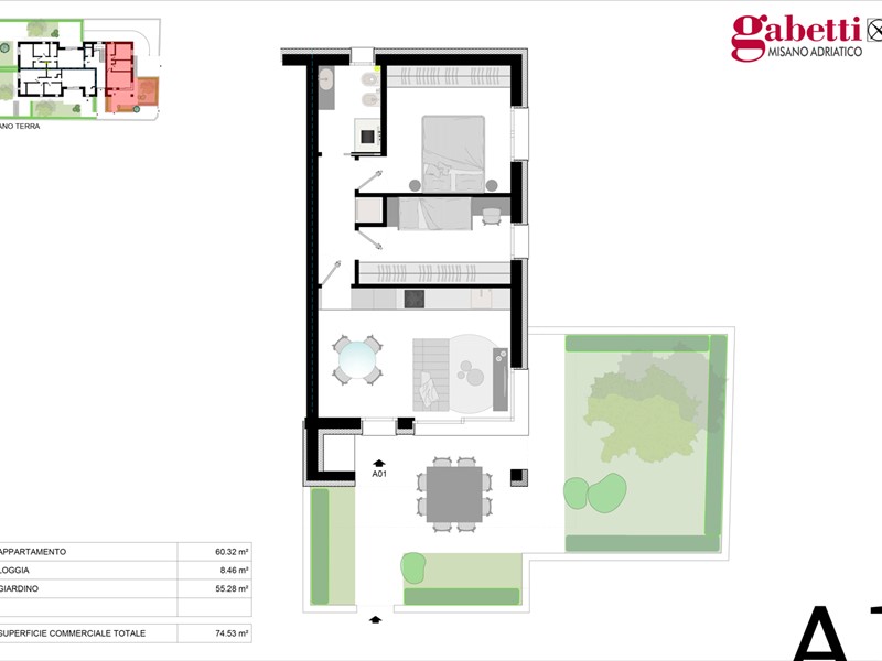 L'appartamento A1 è stato pensato per chi sogna una vita in perfetta sintonia con la natura, senza rinunciare al design contemporaneo. La luminosa zona giorno si apre su un ampio giardino privato, che diventa un'estensione naturale dell'ambiente interno: il luogo ideale per iniziare la giornata con una colazione al sole o per ospitare cene estive in piena intimità. La zona notte ,separata da un disimpegno, è composta da un bagno, una camera singola e una camera matrimoniale