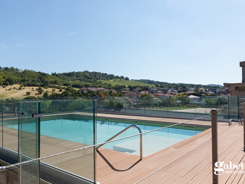 I confort di questa proprietà si completano grazie all'accesso allo splendido terrazzo panoramico con piscina e giardino pensile dal quale si possono ammirare Gradara e il suo Castello, il parco naturale del Monte San Bartolo e il profilo delle iconiche torri di San Marino.