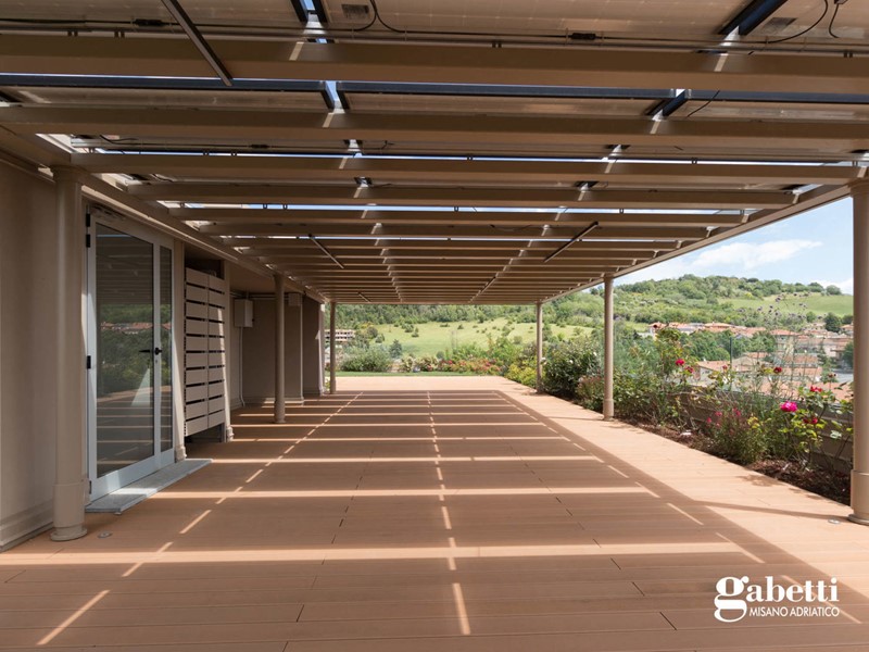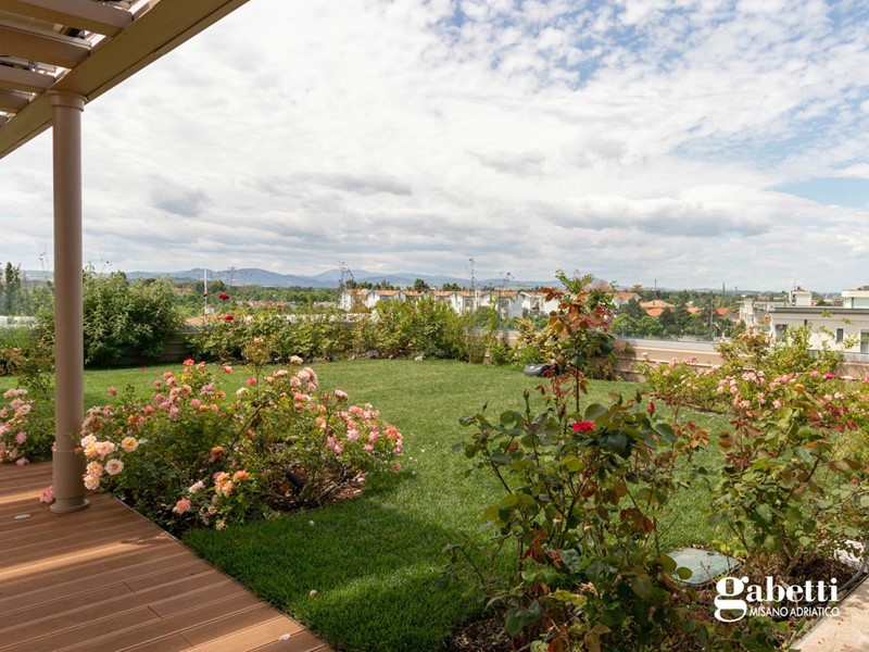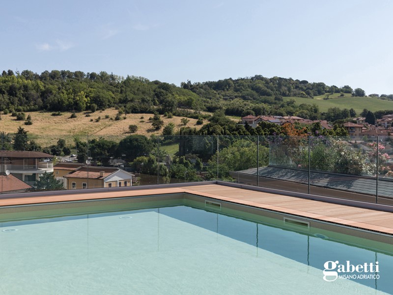 I confort di questa proprietà si completano grazie all'accesso allo splendido terrazzo panoramico con piscina e giardino pensile dal quale si possono ammirare Gradara e il suo Castello, il parco naturale del Monte San Bartolo e il profilo delle iconiche torri di San Marino.