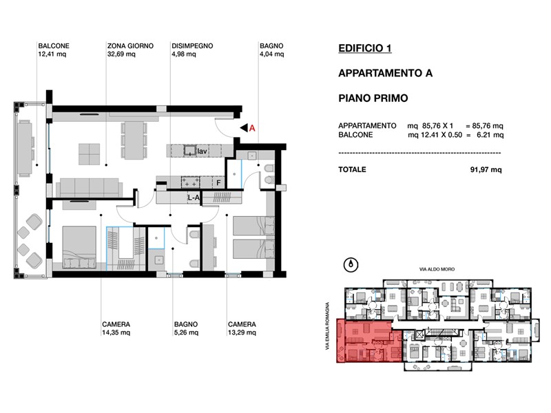 L'abitazione è composta da una luminosa zona giorno di con cucina a vista, una camera padronale con bagno privato, una camera, un secondo bagno e un ampio balcone.