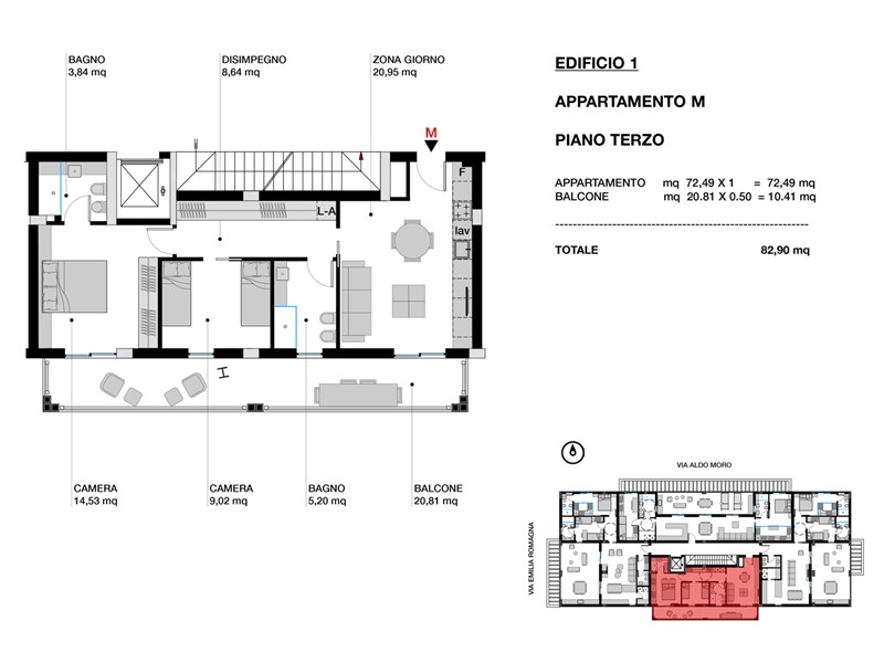 L'abitazione è composta da zona giorno con cucina a vista, camera padronale con bagno privato, una camera, un secondo bagno e un ampio balcone.