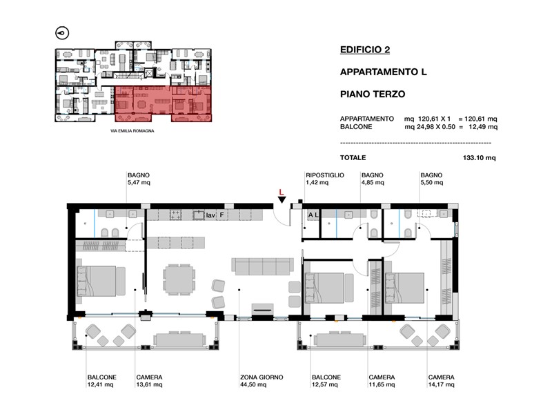 L'abitazione, situata al terzo ed ultimo piano, è composta da un'ampia e luminosa zona giorno con cucina a vista, due suite con bagno privato, una matrimoniale, un terzo bagno e un pratico ripostiglio. I due ampi balconi permettono all'appartamento di godere di luce naturale.