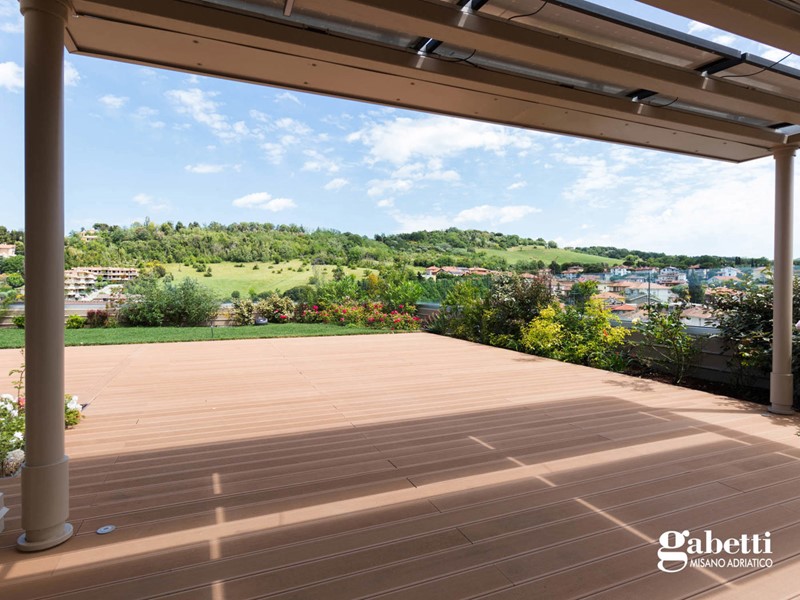 I confort di questa proprietà si completano grazie all'accesso allo splendido terrazzo panoramico con piscina e giardino pensile dal quale si possono ammirare Gradara e il suo Castello, il parco naturale del Monte San Bartolo e il profilo delle iconiche torri di San Marino.