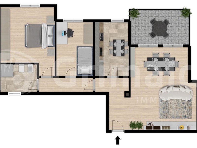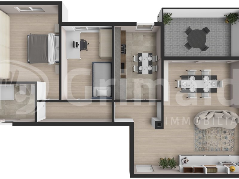 L'ingresso si apre su un ambiente armonioso e funzionale, dove la zona giorno affaccia sul terrazzino, e la cucina separata attigua rendono gli ambienti dedicati e sfruttabili per le loro funzionalità.