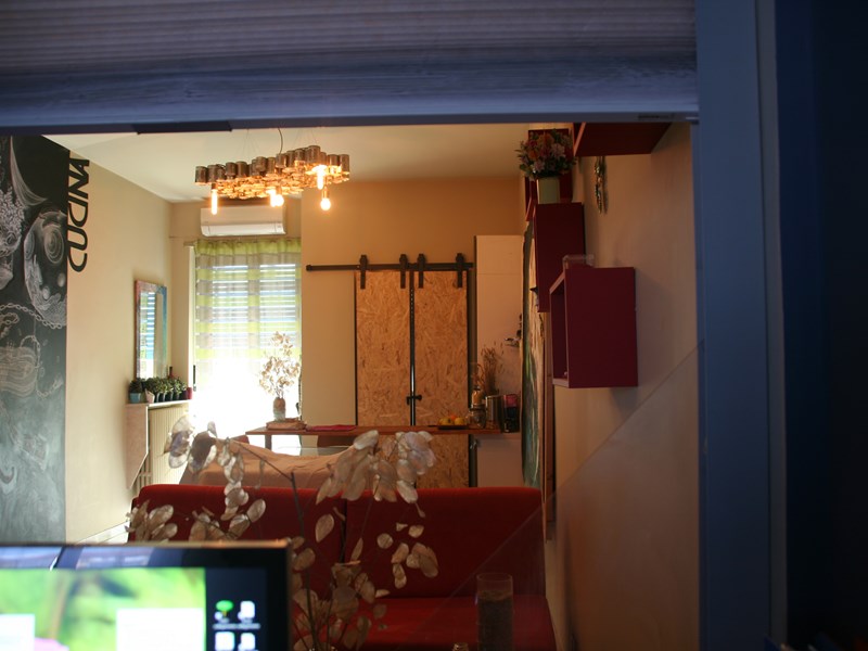 E' un bilocale composto da un soggiorno living e da un'ampia camera, cui si aggiungono un cucinino e un bagno, oltrechè un ripostiglio. Grazie alla posizione defilata del bagno, il soggiorno si presenta ampio e può essere messo all'occorrenza in comunicazione con la camera per creare un open space. Attualmente la camera ospita un angolo-ufficio con parete attrezzata a libreria, che può essere riconvertito a cabina-armadio. Vi sono due balconi, uno a est (lato cortile) e uno in pieno ovest, con vista sulle montagne del Parco Orsiera-Rocciavrè (di fronte vi è il basso fabbricato del supermercato IN's, quindi comoda la spesa dell'ultimo minuto). Sono stati di recente effettuati i seguenti lavori condominiali: ripristino dei frontalini dei balconi e della facciata in generale, tinteggiatura del vano scala, allaccio al teleriscaldamento (centralizzato), sostituzione del sistema elettronico di sbarco ai piani dell'ascensore e della pulsantiera, con inserimento di dispositivo di sicurezza antiapertura porte. L'acqua calda sanitaria è prodotta in modo autonomo da una caldaia dedicata a gas. Vi sono inoltre uno split e un lampadario a ventola che soddisfano le esigenze estive di raffrescamento dell'intera abitazione. Serramenti e finiture da rivedere.