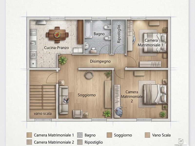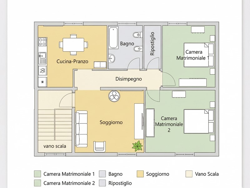 L'appartamento si apre su un ampio ingresso che conduce alla zona giorno, composta da un salotto di 20 mq e una cucina abitabile di 18 mq. La zona notte, ben separata, offre un ripostiglio, un bagno finestrato e due camere matrimoniali dalle metrature introvabili (15 mq e 19 mq).