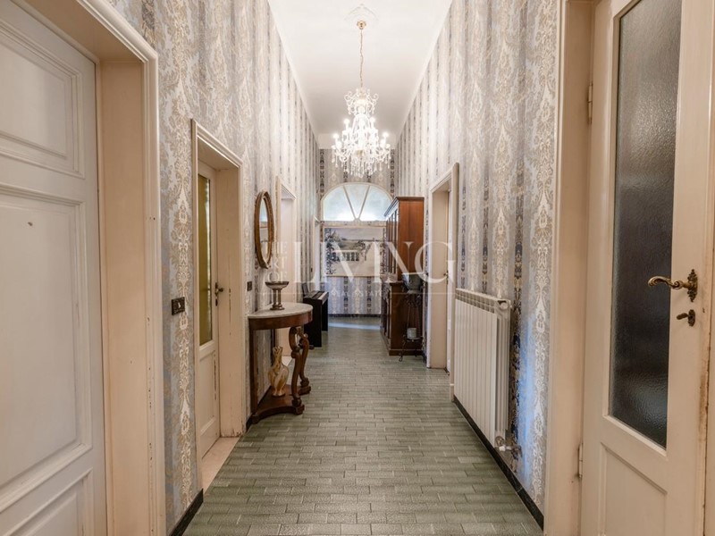 L’appartamento di circa 185 mq, posto al secondo ed ultimo piano, si sviluppa attorno a un corridoio alla cui destra troviamo una stanza utilizzata come cabina armadi, un soggiorno definito da una boiserie, una camera matrimoniale con pavimenti in Tessieri, una sala da pranzo con cucina a vista incorniciata da un elegante arco, due spaziose camere, un bagno di servizio e un bagno finestrato completo di vasca e doccia.