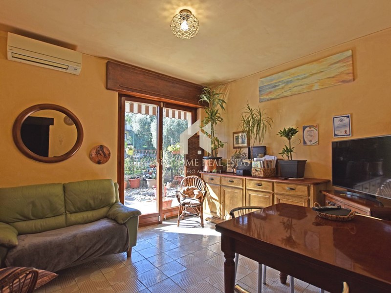 Luminoso soggiorno con climatizzatore inverter e accesso diretto al giardino