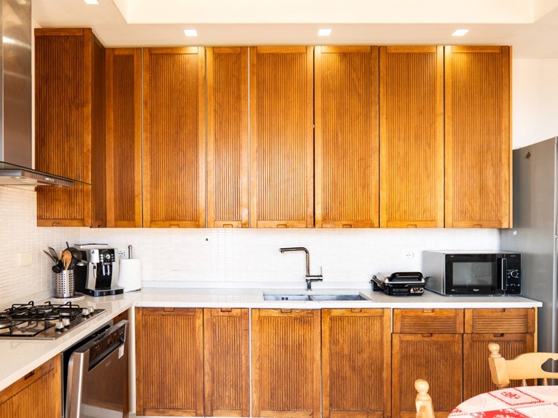 Elemento di grande pregio è il balcone perimetrale che abbraccia labitazione su tre lati, regalando scorci suggestivi sul mare e garantendo una continuità tra interno ed esterno. Una seconda balconata, accessibile da una delle camere, offre invece un affaccio riservato sul verde, ideale per momenti di relax.