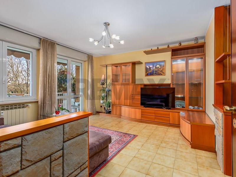 Lingresso conduce a un ampio soggiorno luminoso, ambiente accogliente e ben sfruttabile, con accesso diretto al terrazzo vivibile, ideale per momenti di relax allaperto grazie allaffaccio sul parco.