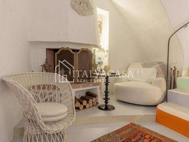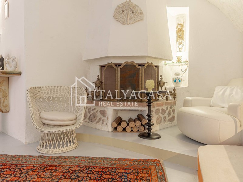 L'appartamento presenta un ingresso indipendente, che conduce a un accogliente soggiorno, luminoso e finemente arredato, dove spiccano dettagli di grande pregio: un vetro Westwood, un mobile buffet provenzale Saint Tropez, una poltrona in pelle Poliform e, a rendere latmosfera ancora più calda e raffinata, un elegante camino.