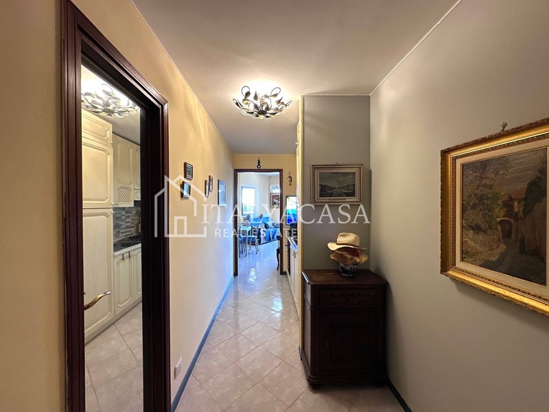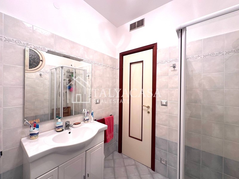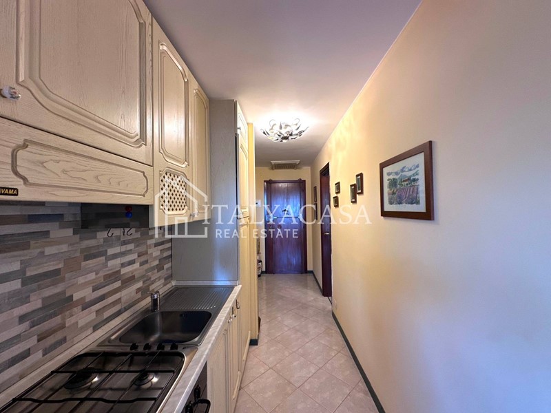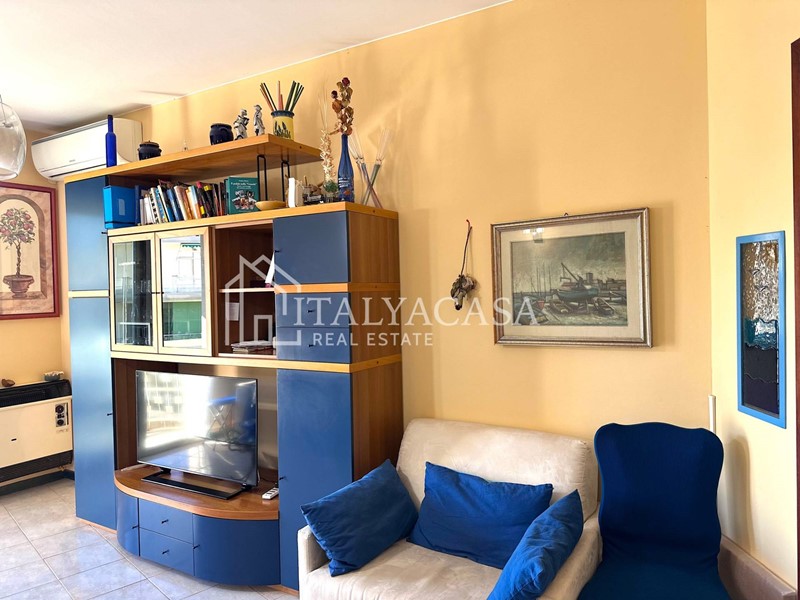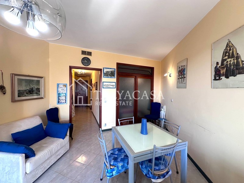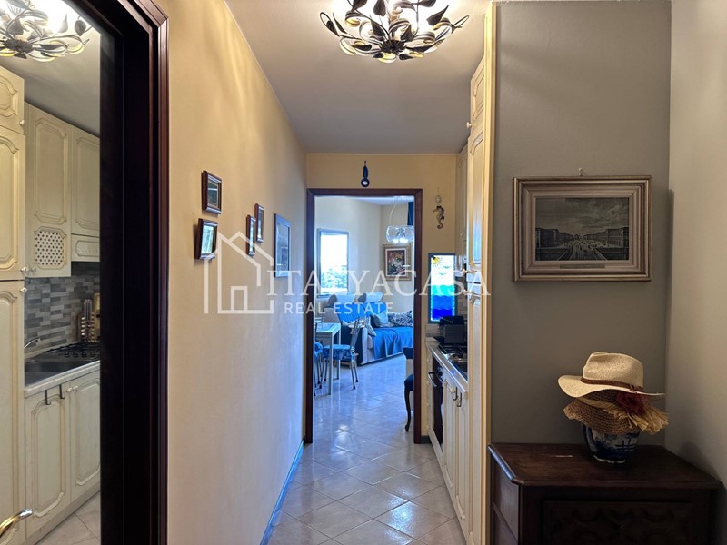 Lingresso conduce alla zona giorno, luminosa e ben proporzionata, con soggiorno e cucina a vista che si aprono su un terrazzino vivibile, dal quale si gode di un gradevole scorcio di vista mare. Un ambiente piacevole e funzionale, adatto alla quotidianità così come ai momenti di relax.