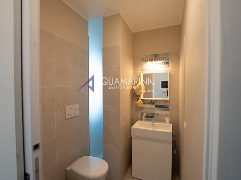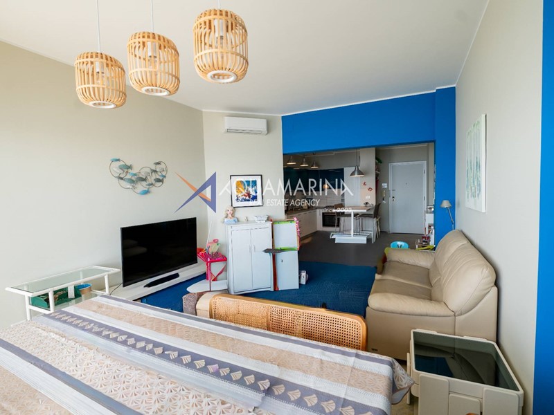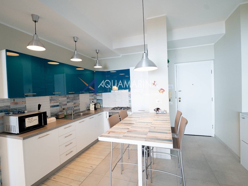 È composto da ingresso, cucina abitabile, ampio soggiorno molto luminoso con accesso diretto alla spettacolare terrazza fronte mare, due bagni e due camere da letto. La camera matrimoniale, particolarmente spaziosa, gode di accesso al terrazzo e di una fantastica vista mare su due lati. Il terrazzo perimetrale è dotato di una comoda doccia esterna.