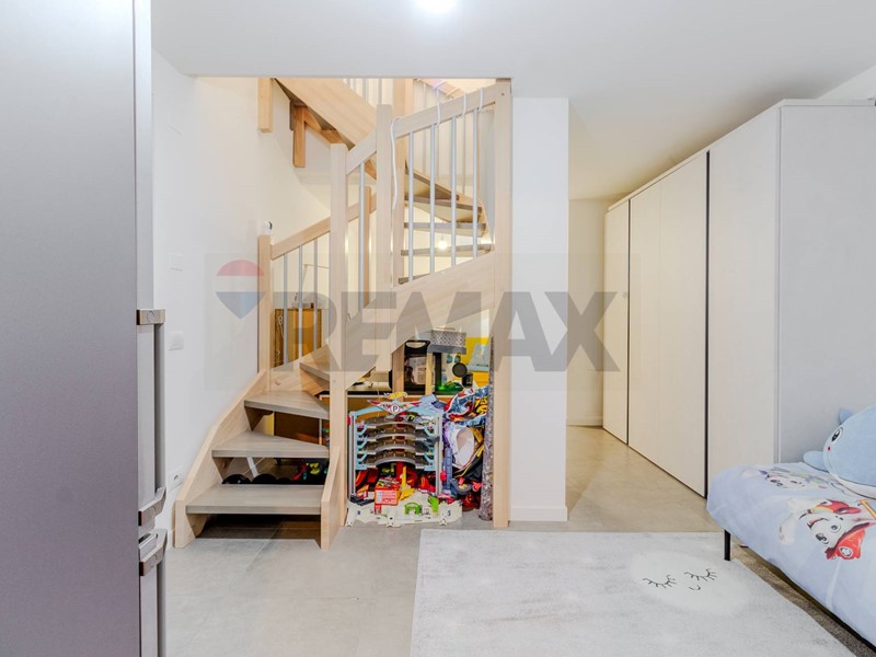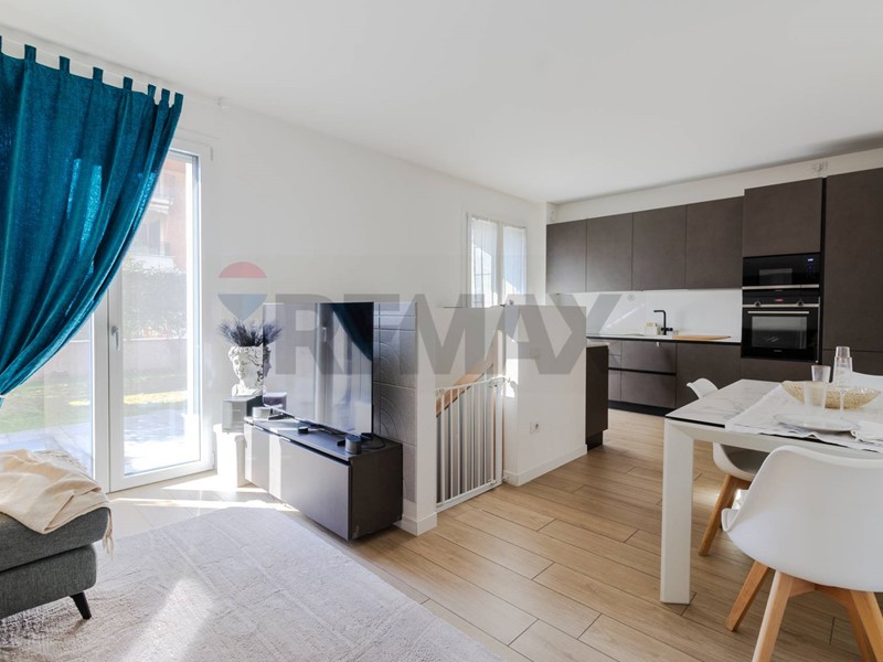 Lingresso si apre su una luminosa zona living con cucina a vista, un ambiente armonioso e funzionale, da cui si accede direttamente al giardino, uno spazio verde riservato dove godersi cene allaperto, momenti di tranquillità o piacevoli serate in compagnia.
