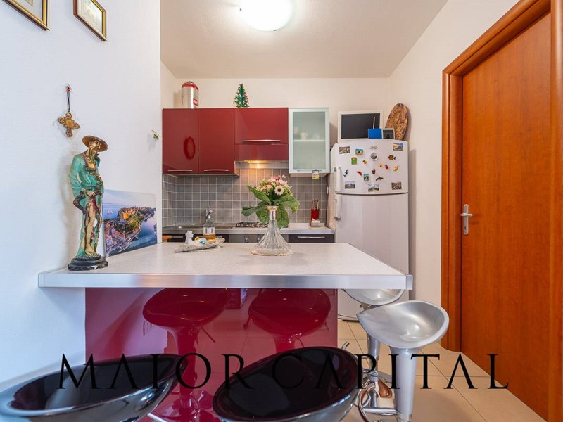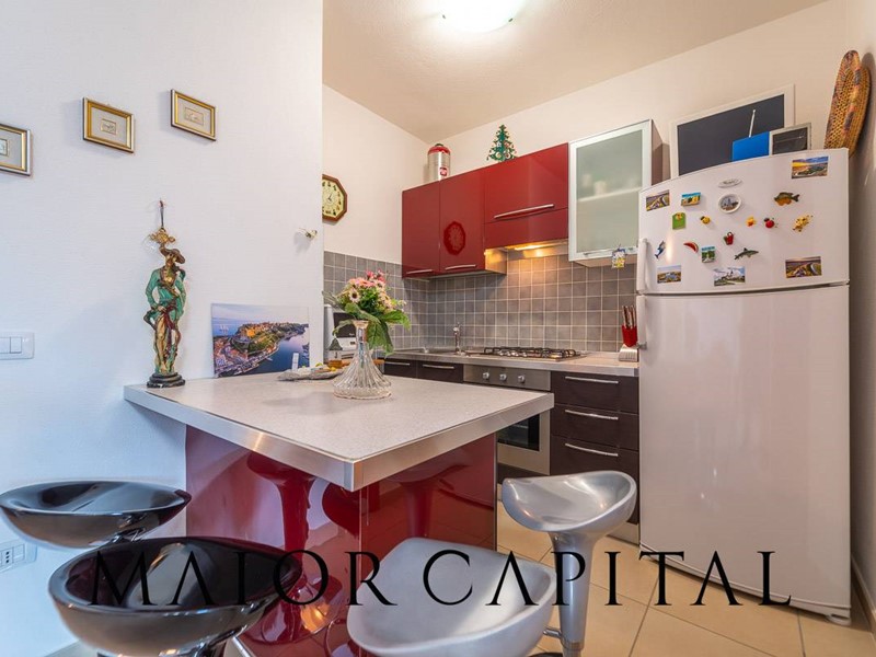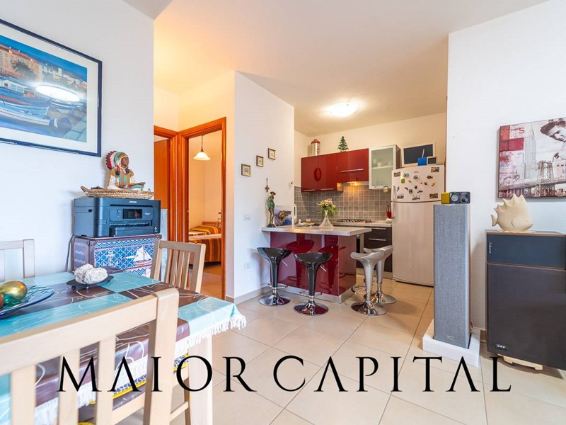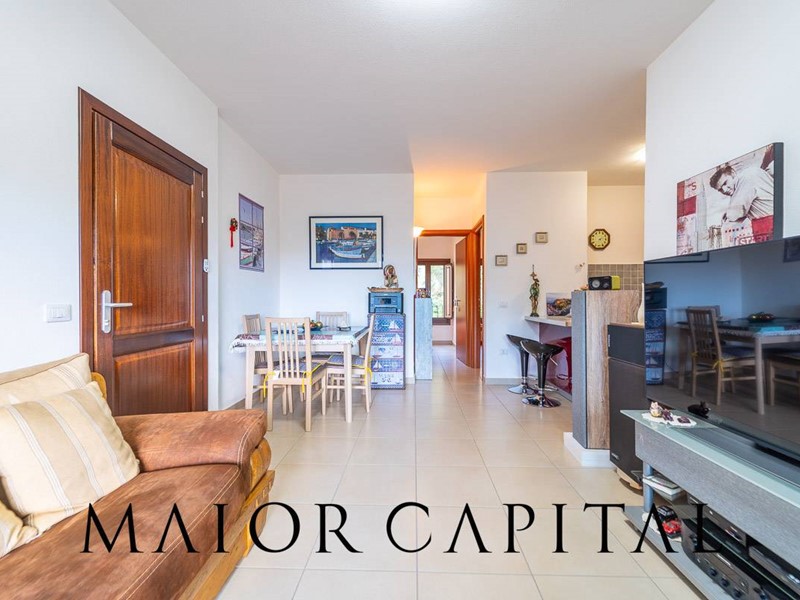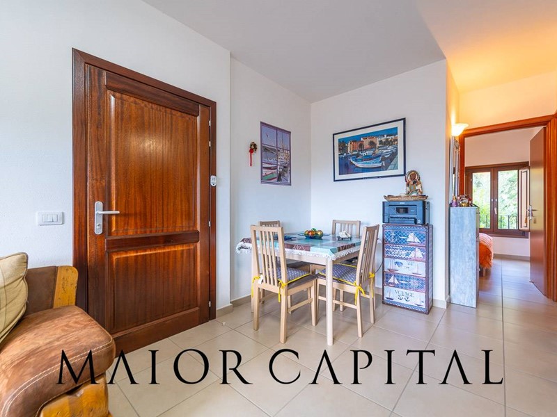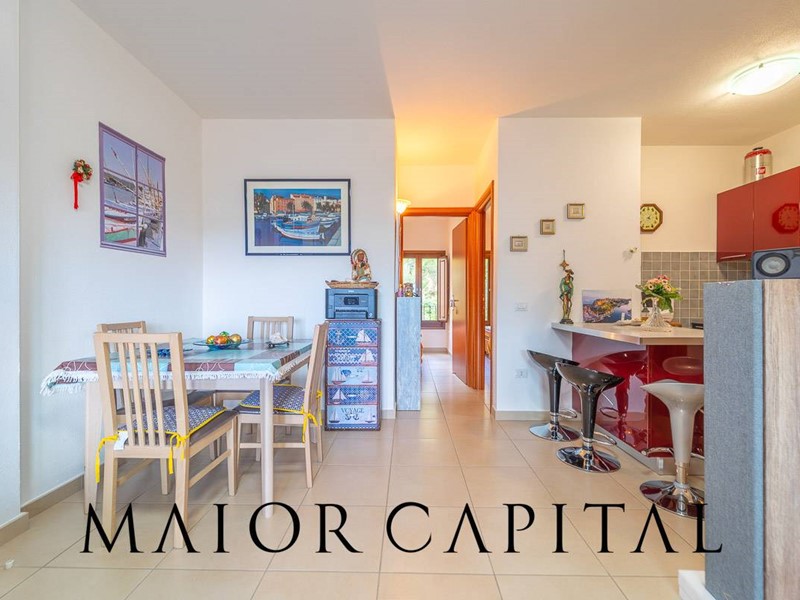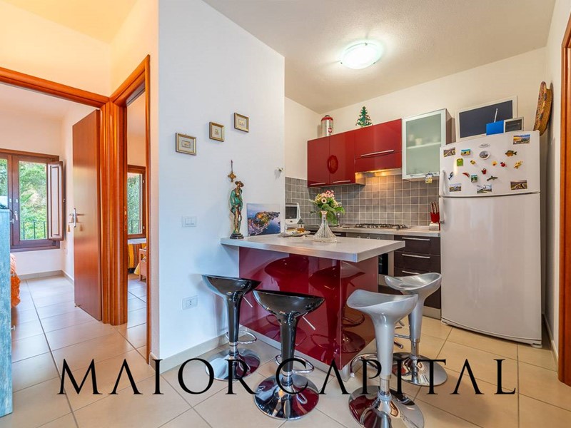 Lappartamento, situato al primo piano e sviluppato su un unico livello, si distingue per la distribuzione armoniosa degli spazi e per la luminosità degli ambienti. Il soggiorno, ampio e accogliente, si apre su una spaziosa veranda coperta, un ambiente ideale da vivere durante gran parte dellanno, impreziosito da un piacevole scorcio di vista mare e dalla cornice naturale della macchia mediterranea. La cucina, organizzata ad angolo, è arricchita da una pratica penisola che si affianca alla zona pranzo, rendendo lo spazio funzionale e conviviale.