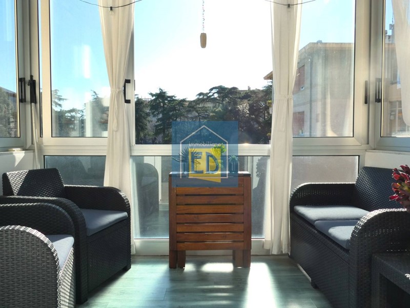 Il soggiorno si apre su una piacevole zona verandata adibita a salottino, con affaccio aperto e vista mare, che conferisce allambiente un immediato senso di comfort e luminosità.