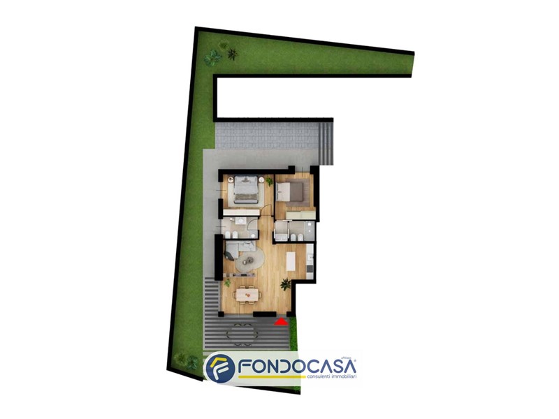 La struttura si sviluppa su due livelli, offrendo quattro soluzioni abitative distinte. Il trilocale, situato al piano terra, è composto da ingresso su soggiorno con cucina a vista, due camere, due bagni e uno spazioso giardino.