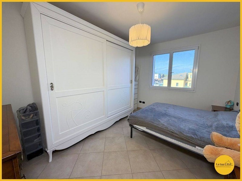 Lingresso conduce a un luminoso soggiorno con cucina a vista, con accesso al balcone. Si prosegue con due spaziose camere da letto matrimoniali e da un bagno finestrato dotato di box doccia.