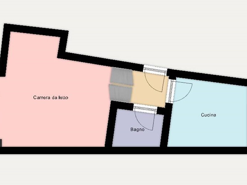 Ingresso su disimpegno del piano primo, zona giorno con cucina a vista, bagno con doccia, camera da letto e sfoghi esterni.