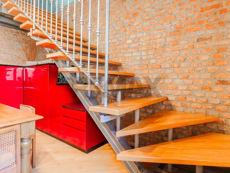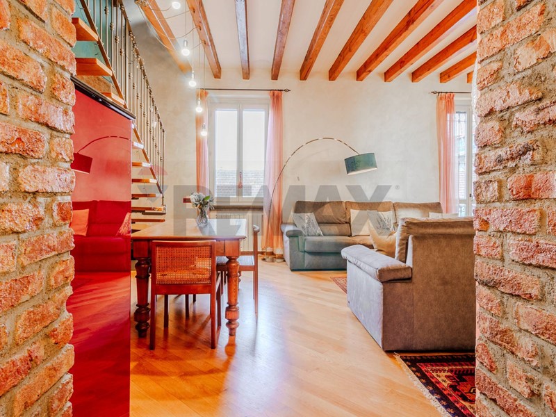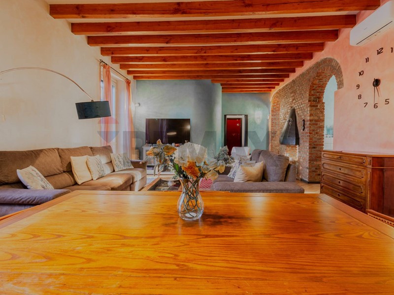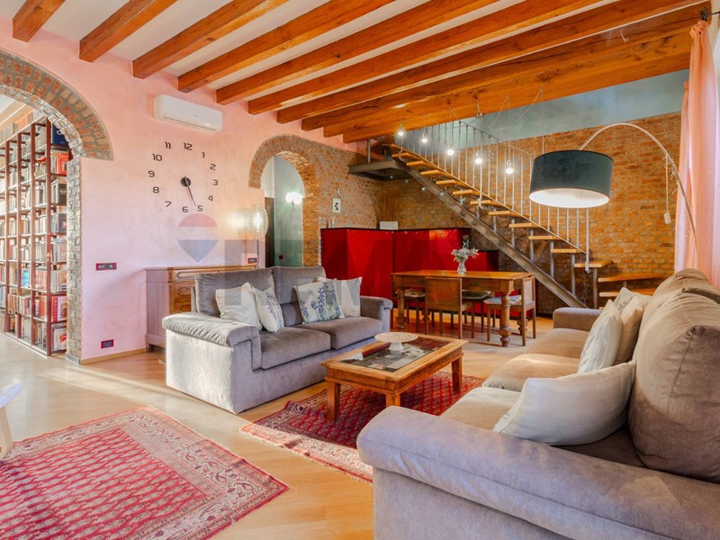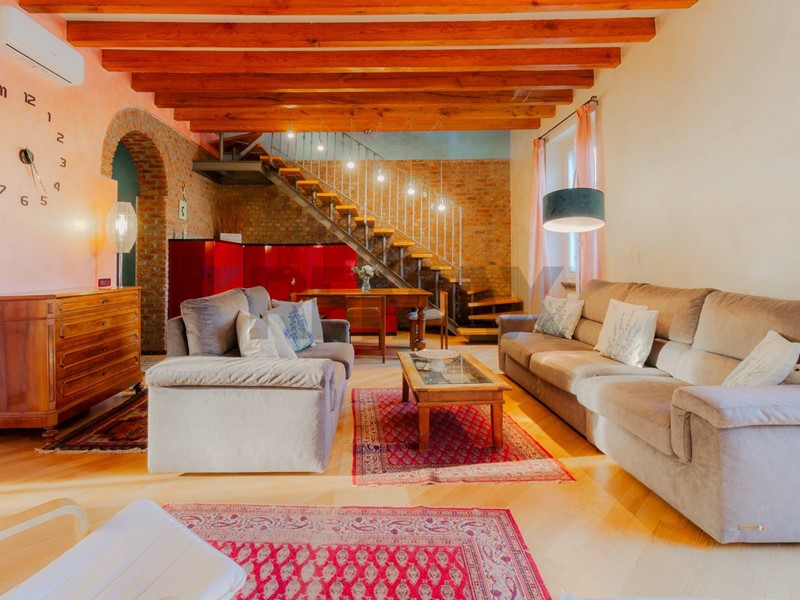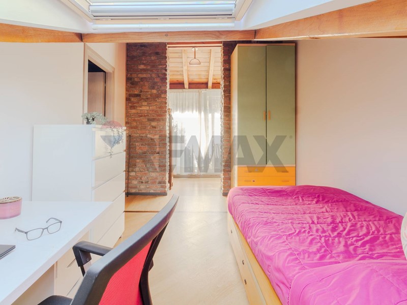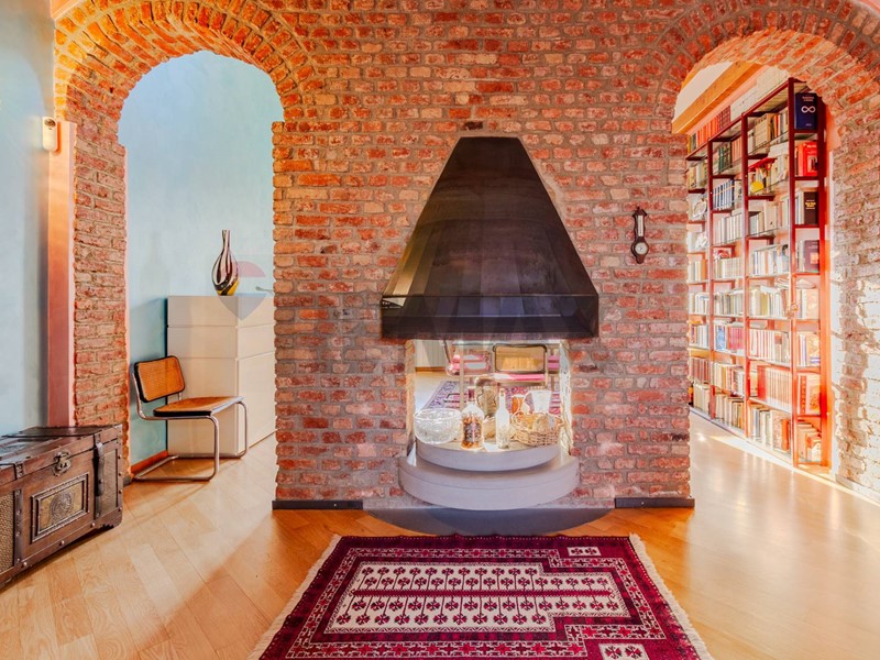 Lingresso si apre direttamente su un soggiorno di grande impatto, dove ogni elemento racconta personalità: lampia libreria a parete, il camino, i mattoni a vista e le travi in legno creano un ambiente accogliente, intimo e ricco di fascino. Uno spazio che invita a vivere la casa con autenticità, tra momenti di relax e convivialità.