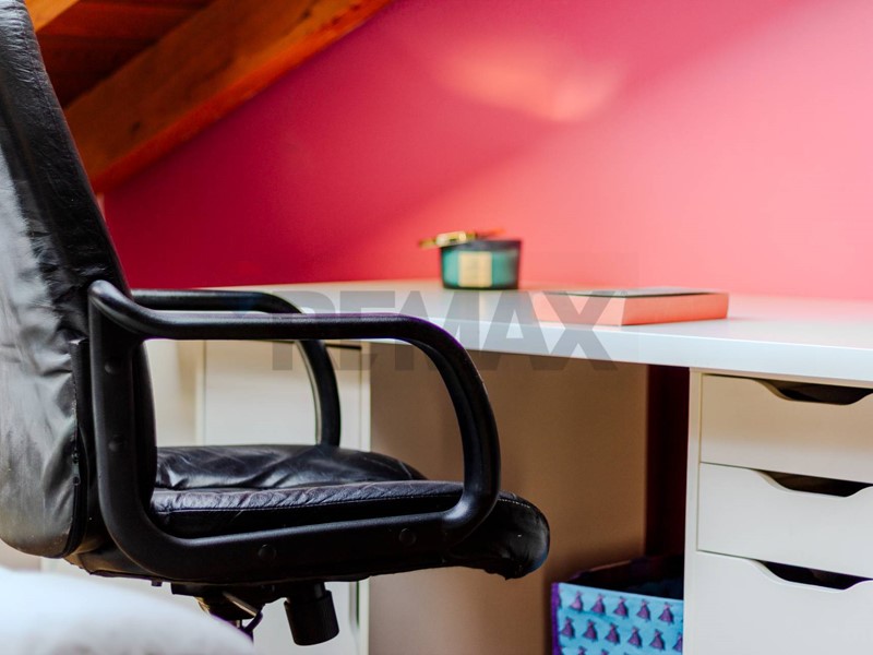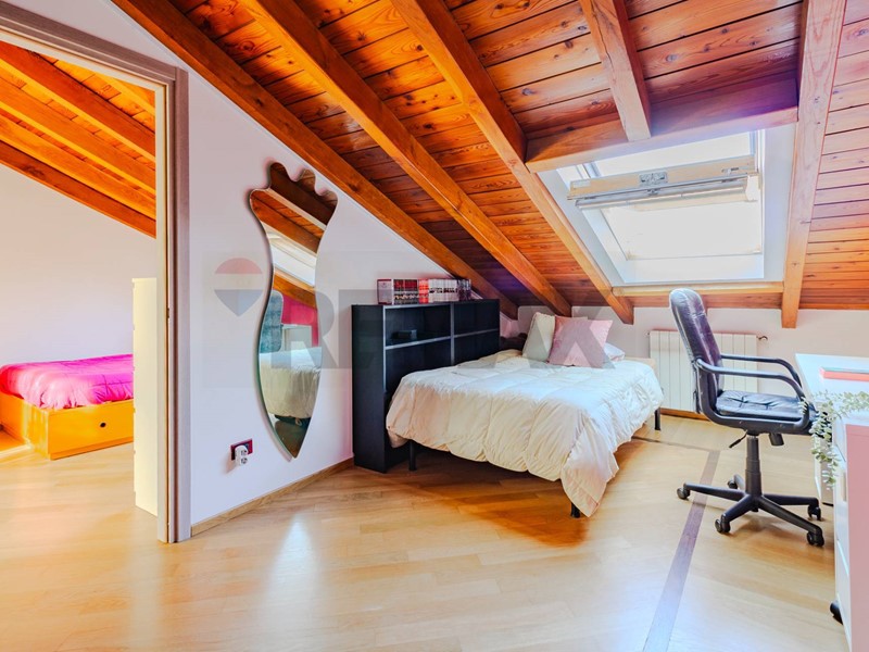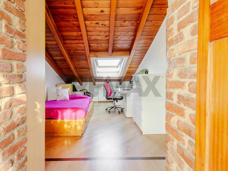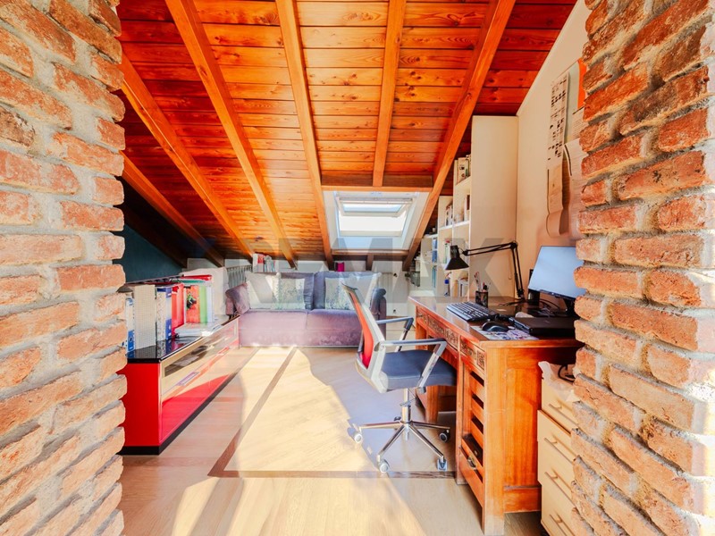 Una scala in legno ampia e armoniosa conduce al piano superiore, dove il sottotetto è stato sapientemente valorizzato e suddiviso in tre ampi spazi, versatili e luminosi, perfetti come ulteriori camere, studio o zona relax. Il piano è servito da un secondo bagno.