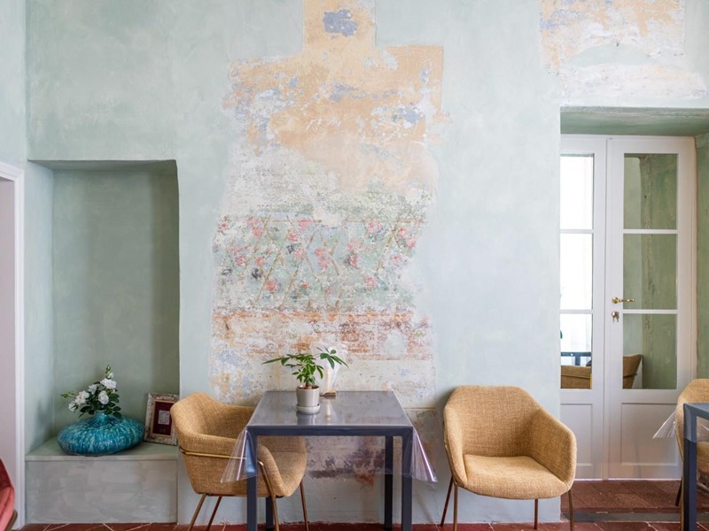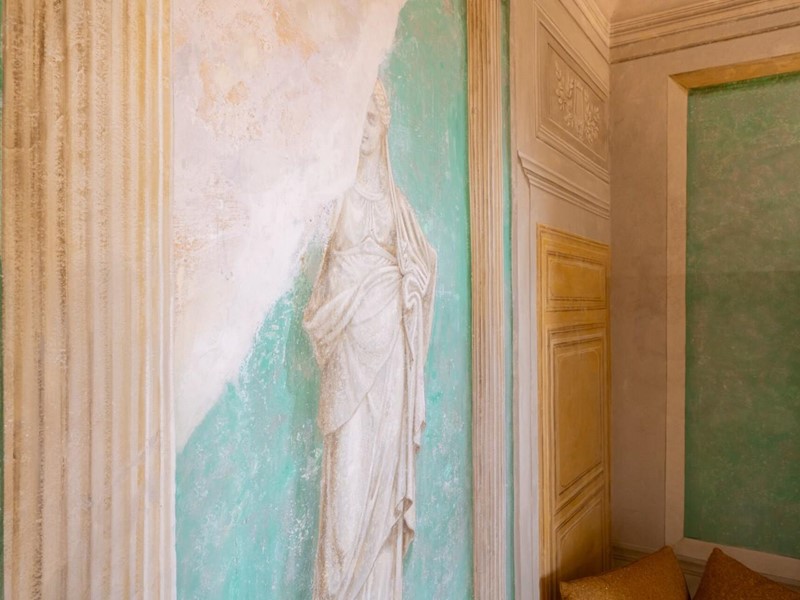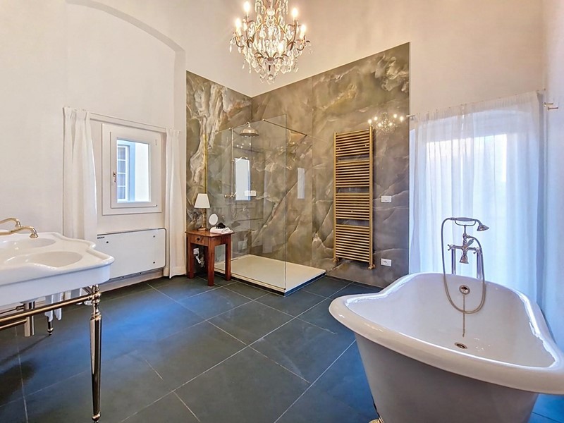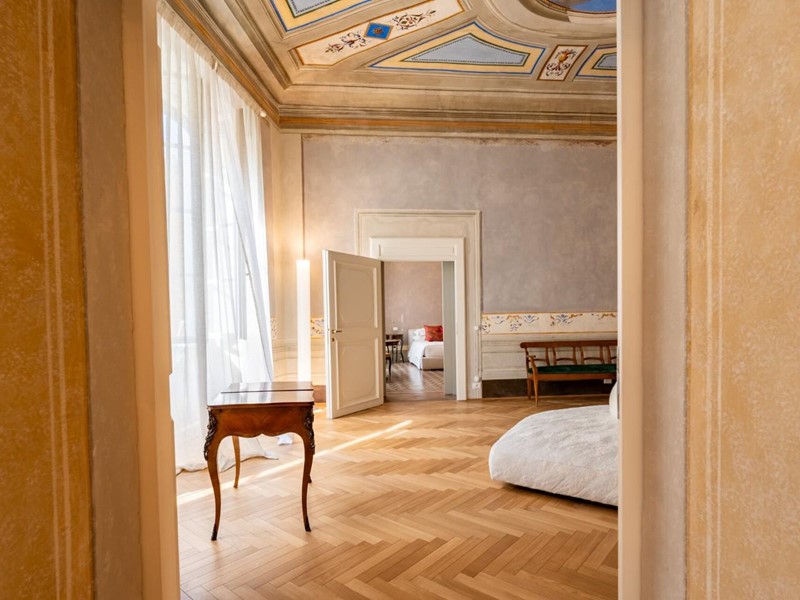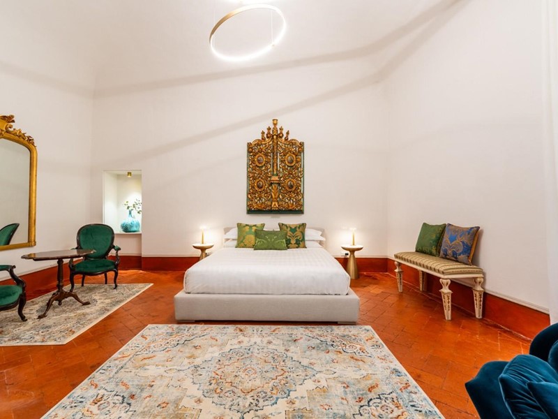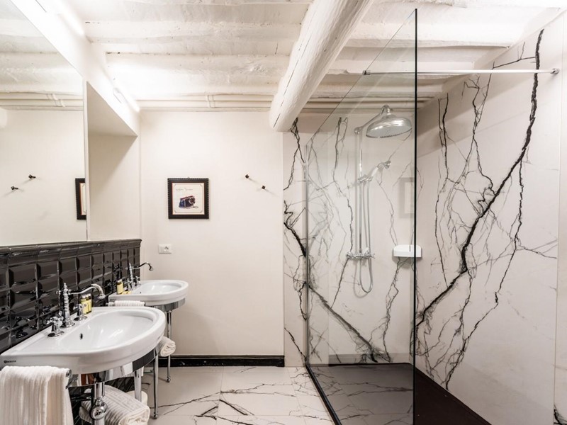 Ogni suite è dotata di bagno privato rifinito con marmi pregiati, finiture eleganti e arredi distintivi. In diverse stanze sono ancora presenti camini storici, mentre i pavimenti alternano cotto originale, cementine decorative e parquet posato a spina di pesce, offrendo varietà e carattere a ogni ambiente.