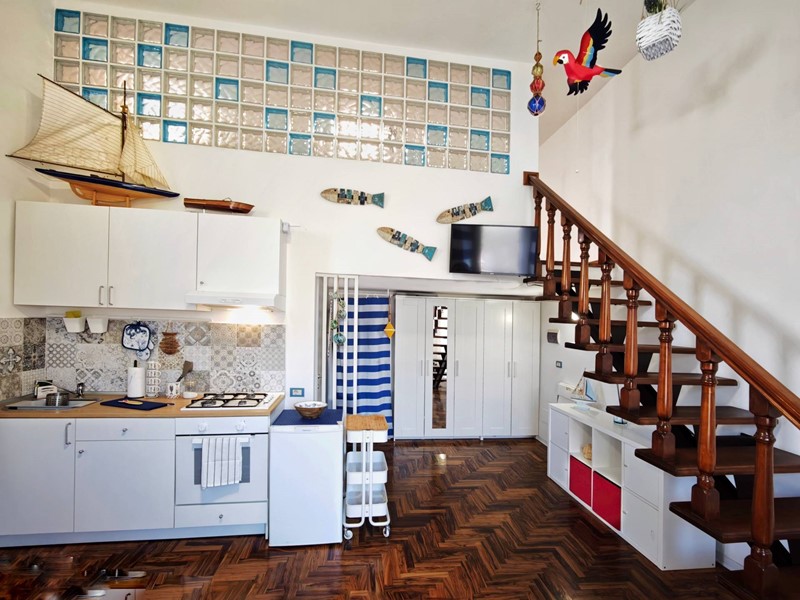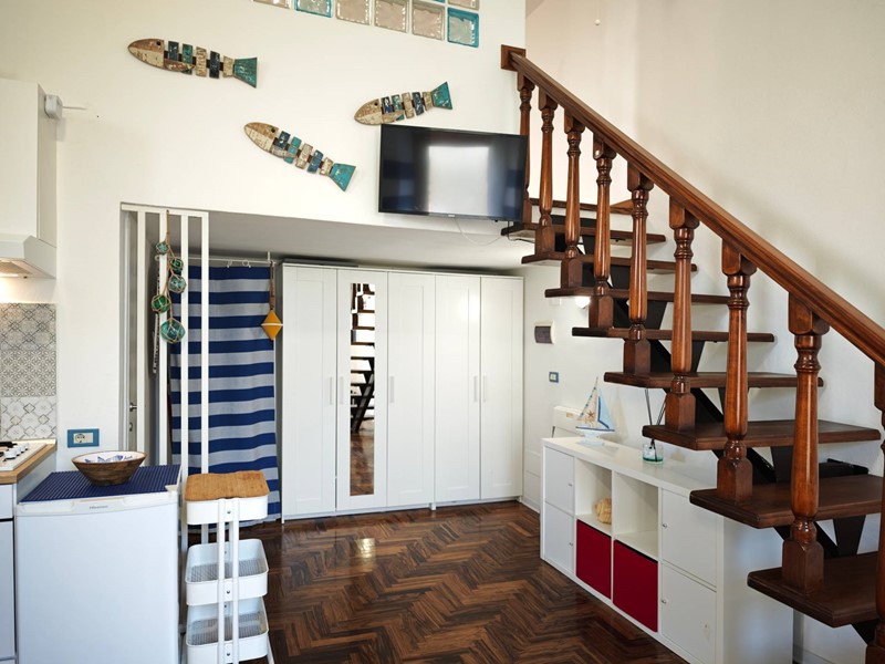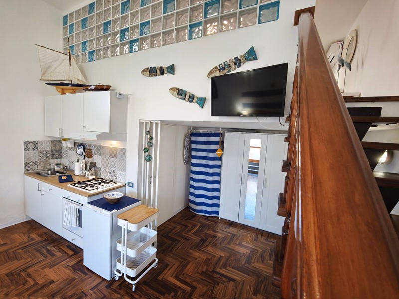 Delizioso appartamento a Talamone. E un accogliente loft su due livelli, finemente ristrutturato e curato nei dettagli con uno stile marinaro moderno che richiama latmosfera del porto, proprio di fronte al quale si trova.