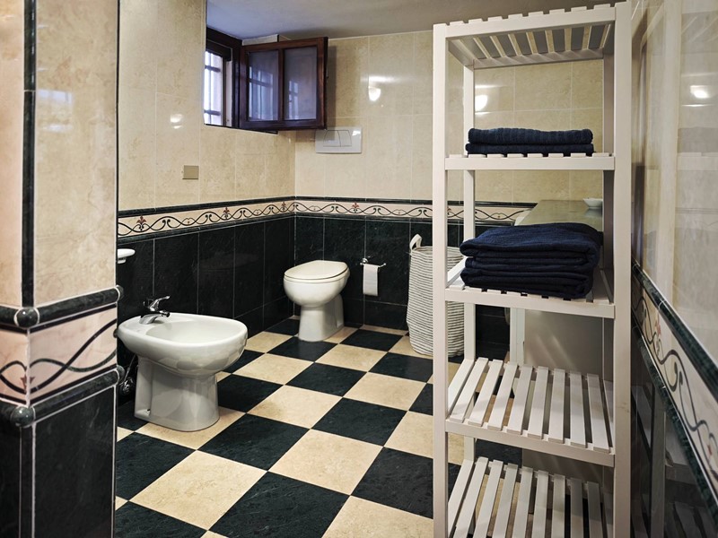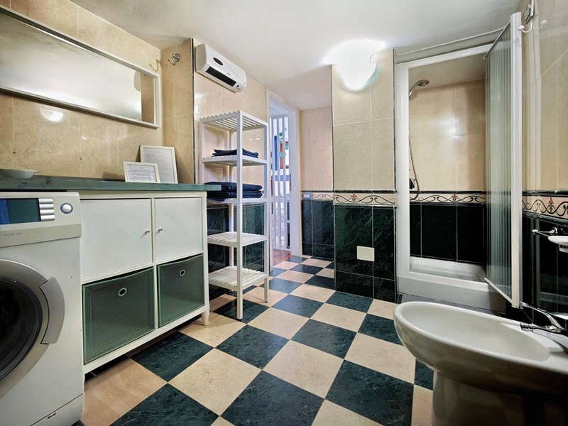 Bagno ampio finestrato, comodo, ben inserito nella disposizione del piano, con antibagno e dotato di lavatrice e box doccia .