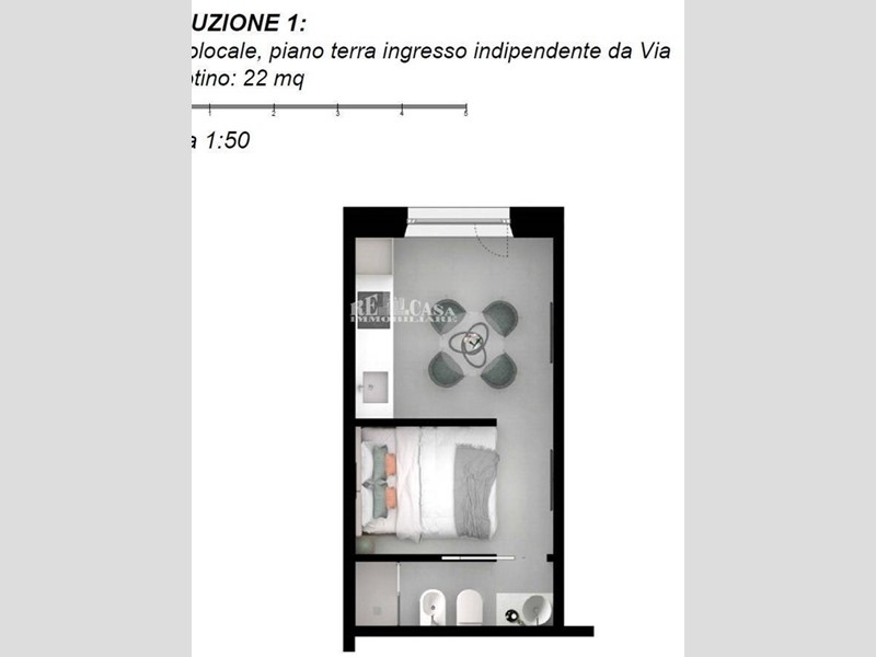 Monolocale di 22 mq al piano terra con ingresso autonomo composto da ingresso su soggiorno con cucina open-space, una camera da letto matrimoniale ed una doppia, un bagno con doccia con areazione forzata.