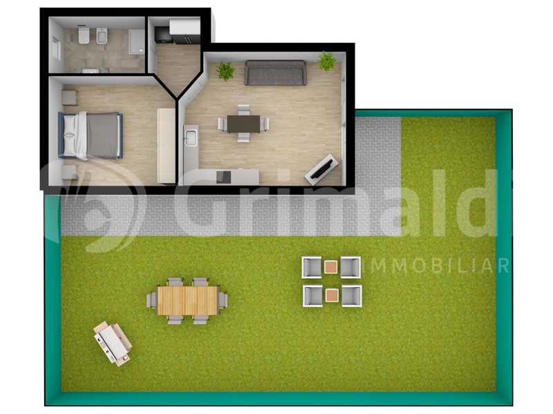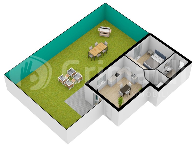 L'appartamento è composto da ingresso in soggiorno con angolo cottura il tutto affacciato su uno splendido giardino privato di 120 mq con doppia esposizione ad angolo.