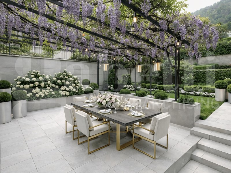 L'ingresso si apre su un generoso disimpegno che conduce alla luminosa zona giorno, composta da un ampio soggiorno con accesso diretto alla suggestiva pergola immersa nel verde e alla grande terrazza di proprietà e da una cucina abitabile separata,