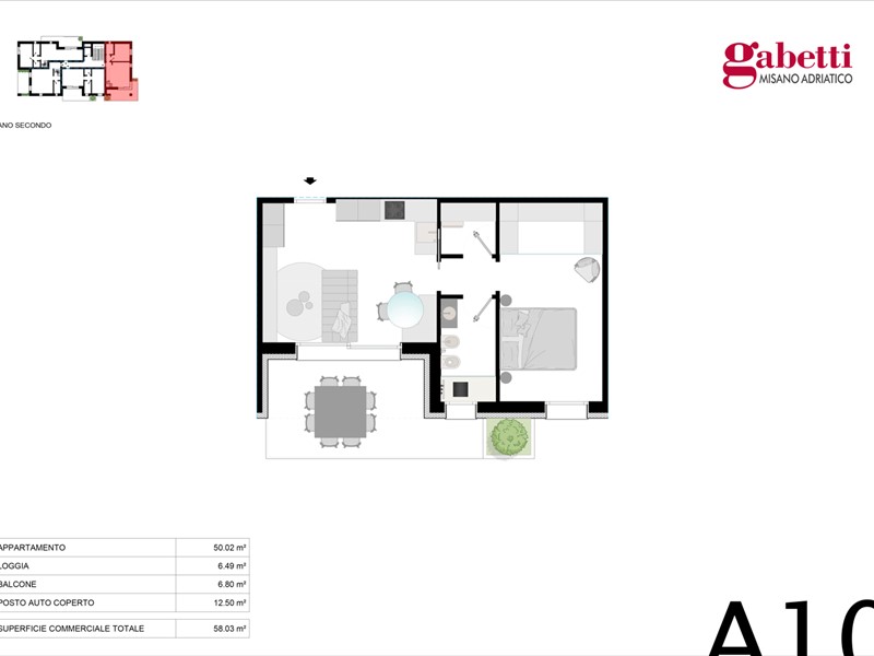 Un appartamento che gioca con la luce e le prospettive, offrendo il comfort di uno spazio raccolto ed elegante. L'appartamento A10, situato al secondo piano, è una soluzione dove il design contemporaneo incontra la vivibilità in ogni stagione. La generosa zona giorno si affaccia su un ampio balcone in parte loggiato, un'estensione protetta e soleggiata della casa.