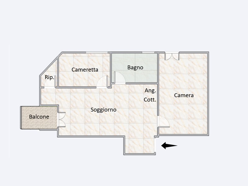 L'appartamento è composto da: ingresso, soggiorno con angolo cottura e balcone panoramico, camera da letto matrimoniale, cameretta, ripostiglio e bagno.