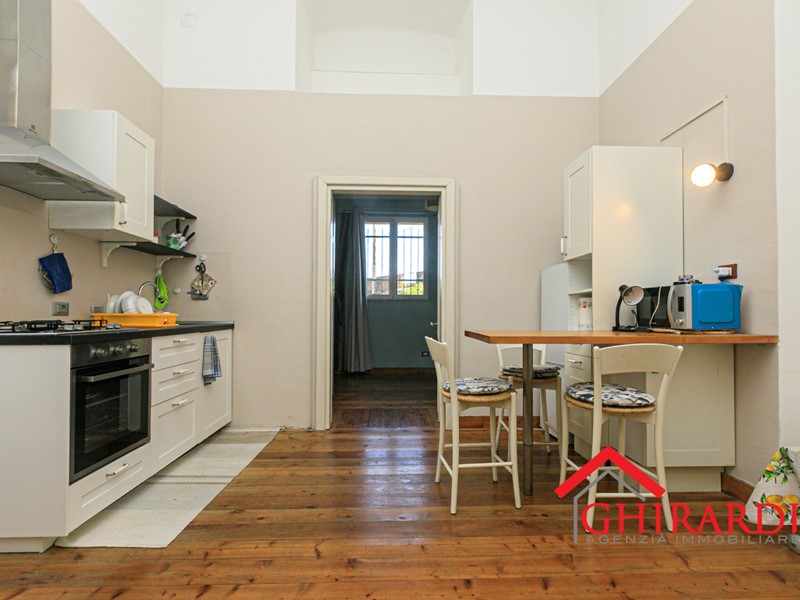 L’interno si apre su un accogliente open space con cucina a vista, impreziosito da finiture in parquet che donano calore e stile all’ambiente.