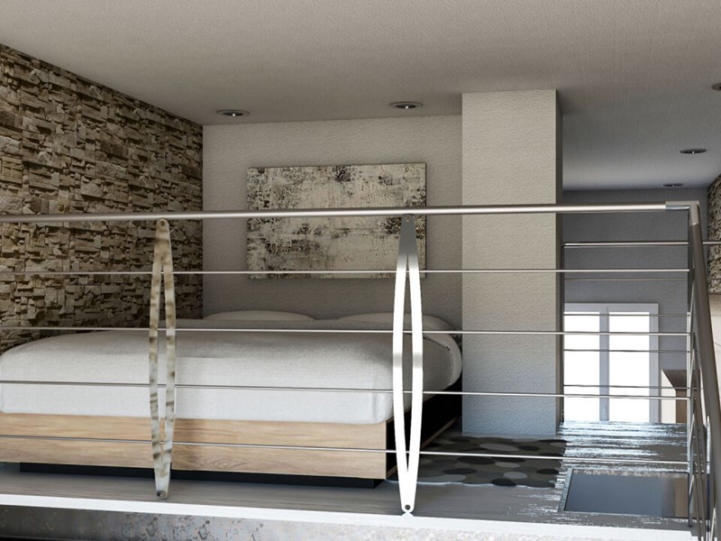 Particolarmente interessante è la possibilità di realizzare un soppalco, come evidenziato nei render, che permetterebbe di separare la zona notte e ottimizzare ulteriormente gli spazi, aumentando comfort e funzionalità.