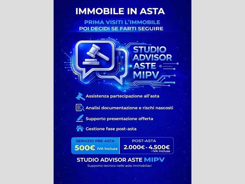 Nota informativa Questo annuncio è stato redatto da Studio Advisor Aste MiPv sulla base della documentazione ufficiale di vendita. Le informazioni qui riportate non sostituiscono la pubblicità legale e potrebbero contenere imprecisioni o variazioni rispetto agli atti ufficiali. Studio Advisor Aste MiPv declina ogni responsabilità per errori, omissioni o modifiche intervenute successivamente alla pubblicazione.