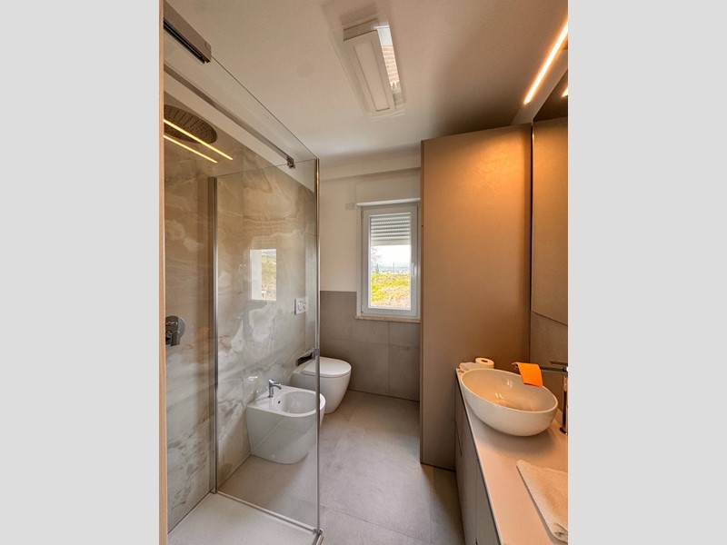 Il riscaldamento è del tipo radiante a pavimento gestito da una pompa di calore elettrica, a sua volta alimentata dai pannelli fotovoltaici presenti in copertura di Kw 4.4 con annesso accumulatore.