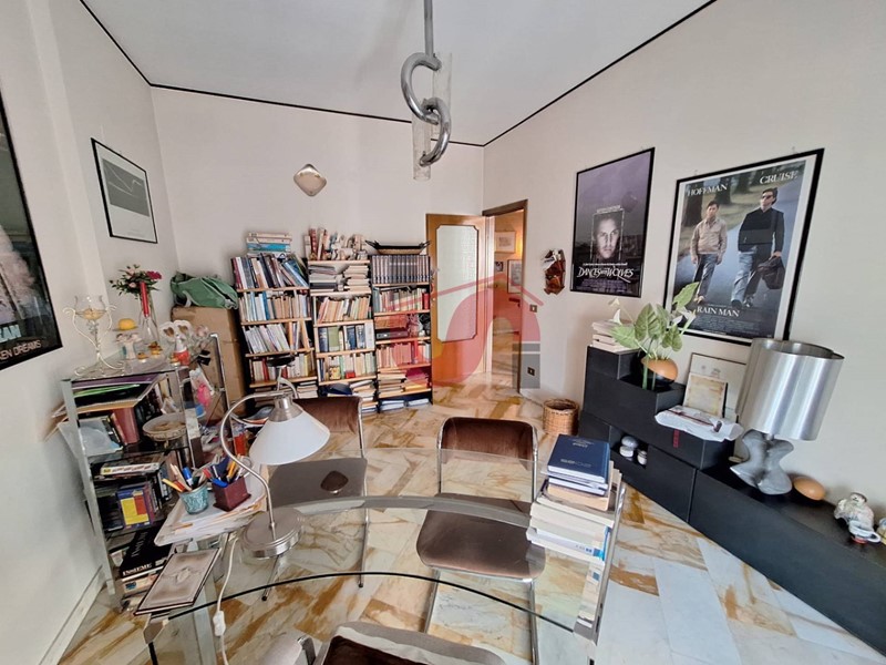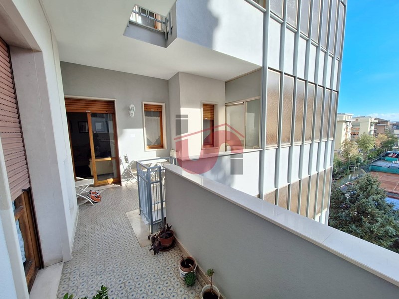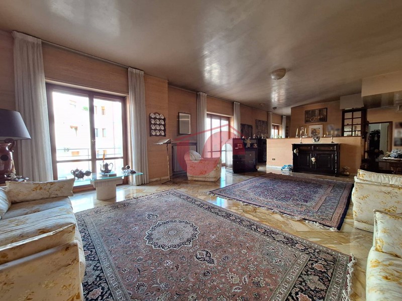 L'appartamento, splendidamente circondato su ogni lato da ampia balconata accessibile da ogni vano, gode di doppio ingresso da pianerottolo (lato cucina e salone) che di per sé è già una peculiarità molto ricercata e al suo interno si compone di un godibile salone doppio e attigua sala, che allo stato risulta una ideale proiezione del salone stesso, cucina abitabile, sala da pranzo, corridoio, un comodo studio, disimpegno, tre ampie camere da letto e due bagni entrambi dotati di finestra. Il balcone, nel suo punto più ampio presenta anche una veranda che alloggia tutta la zona lavanderia ed i propri accessori. Ciò che impreziosisce ancora di più l'intera proprietà è il comodo box auto privato di 50mq ca. posto al piano seminterrato e raggiungibile internamente con ascensore tramite il relativo vano scala.