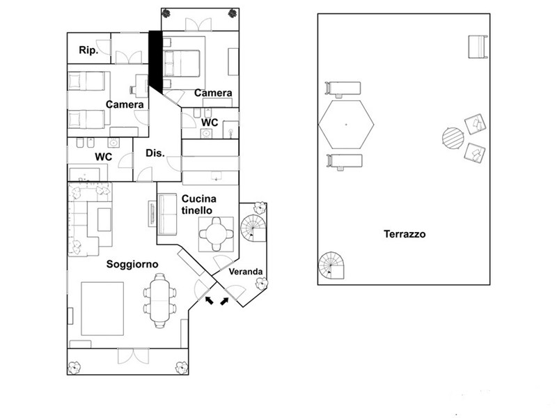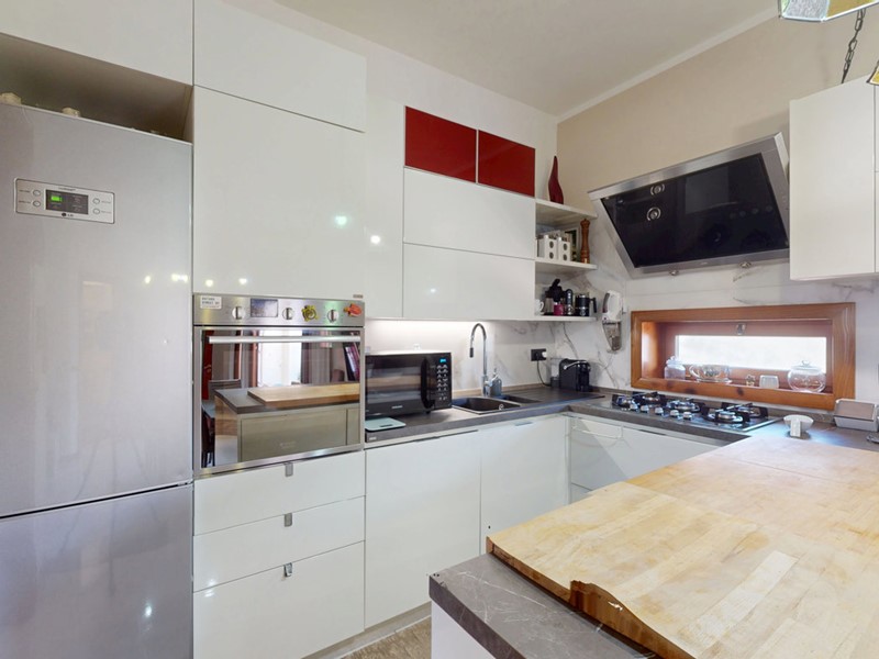 Il secondo ingresso, dal balcone verandato della cucina, consente un collegamento diretto e riservato con il terrazzo di copertura tramite scala privata, rendendo l'utilizzo dello spazio esterno estremamente pratico.